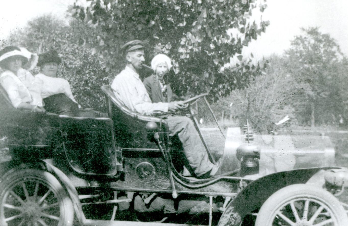 Thomas Stampfly c1913 driving with daughter Edith and (back) Lula (Swender) Stampfly, Wilma Henning, and Lela Henning. photocopy
