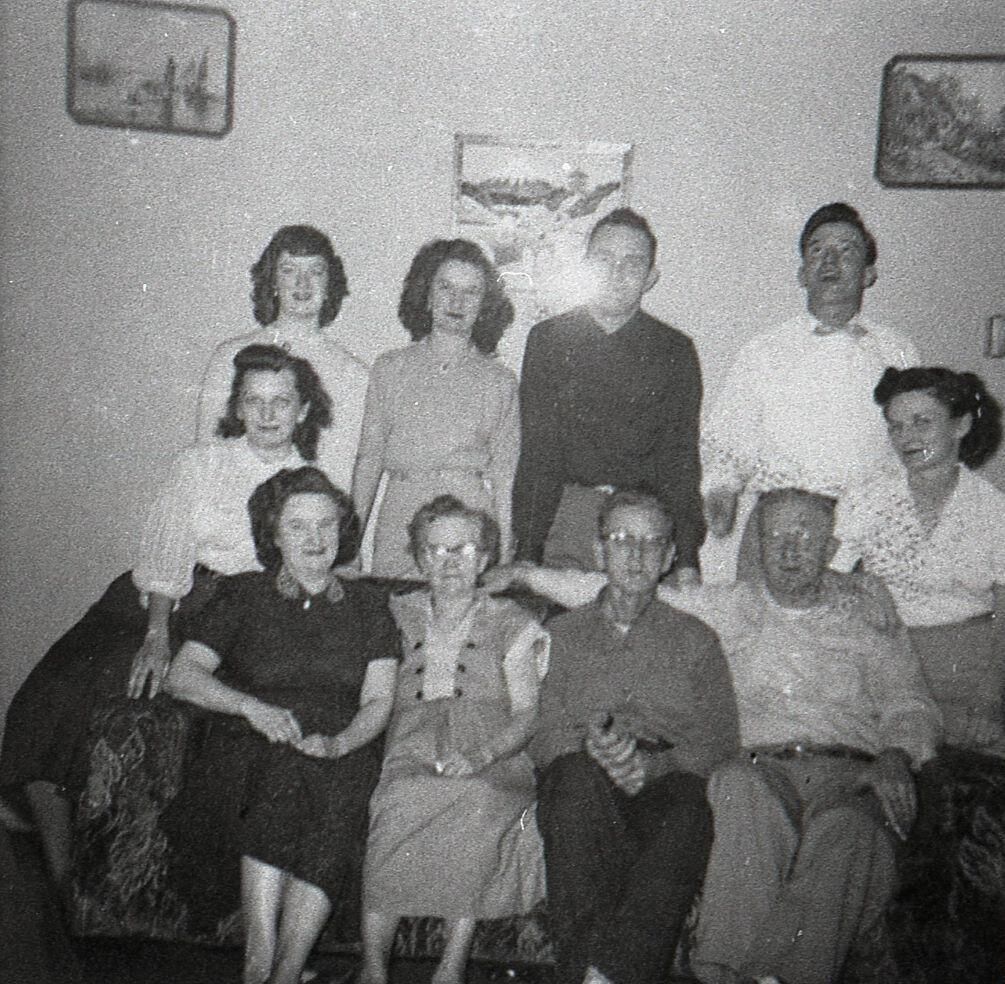 Children of Jesse Sturgis, 30April1952. (back) Rose, Dorothy, Time, Dick, (front) Laura, Helen, Mom, Pop, Milo, Anna. Scan of negative from 1980 History of Clinton County page 292.