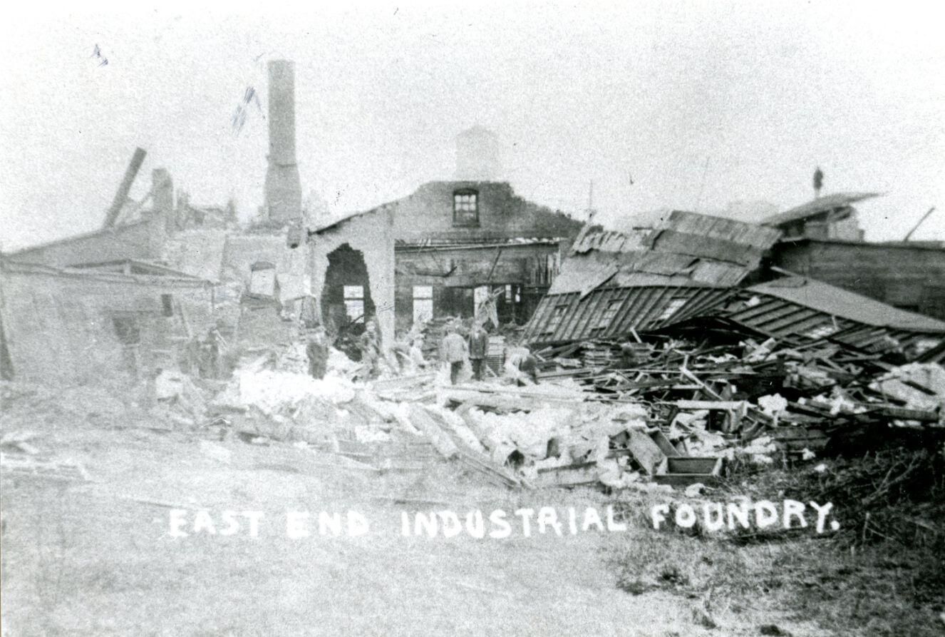 East end of the industrial foundry in St. Johns after 1920 tornado. Another copy PI212-137.