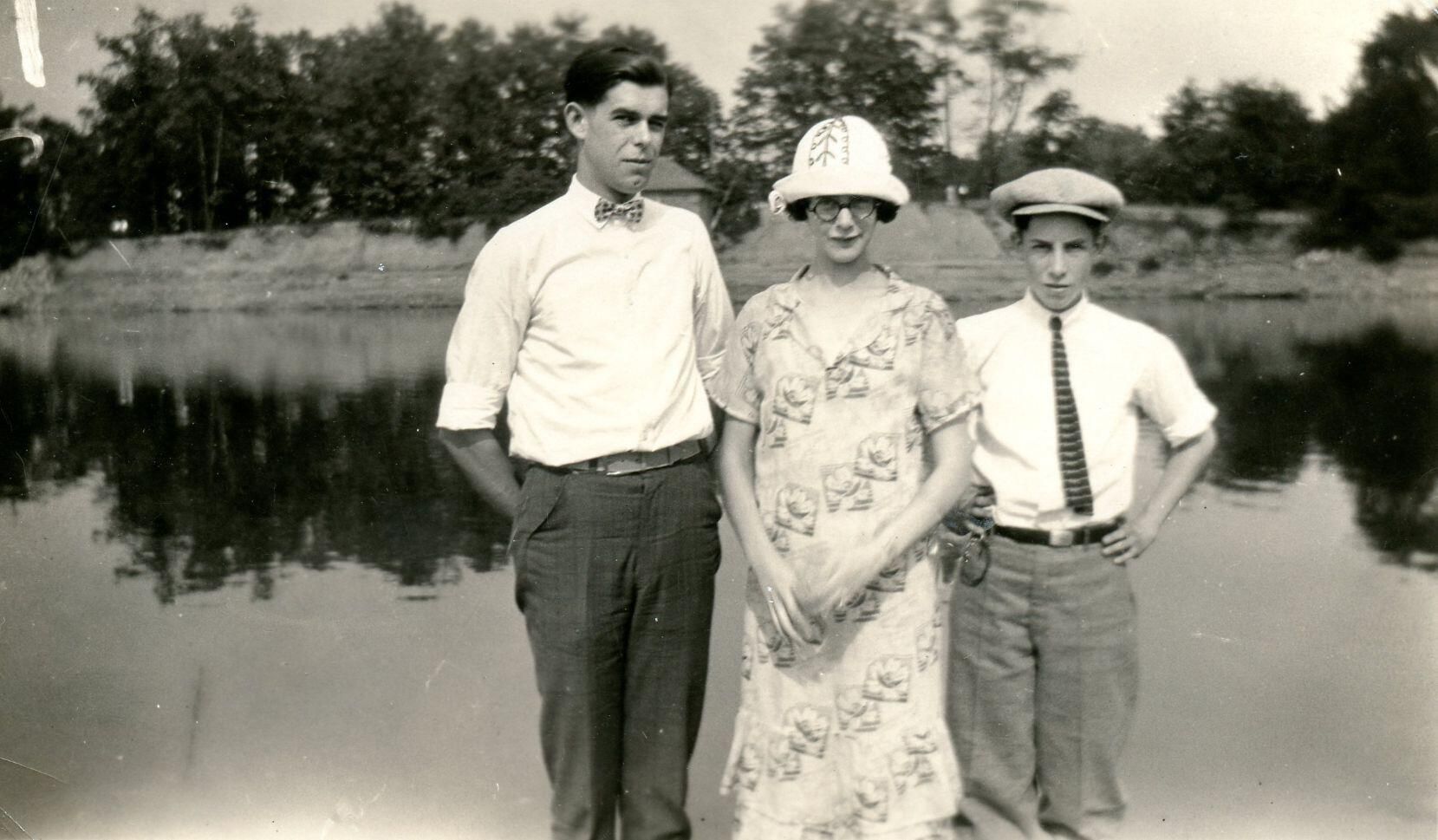 Unidentified group in front of a lake.