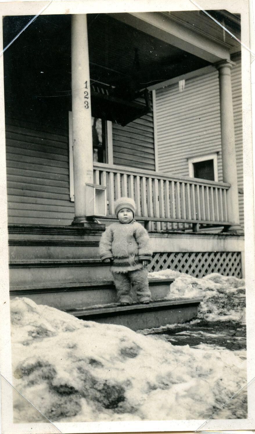 Unidentified child on steps in winter