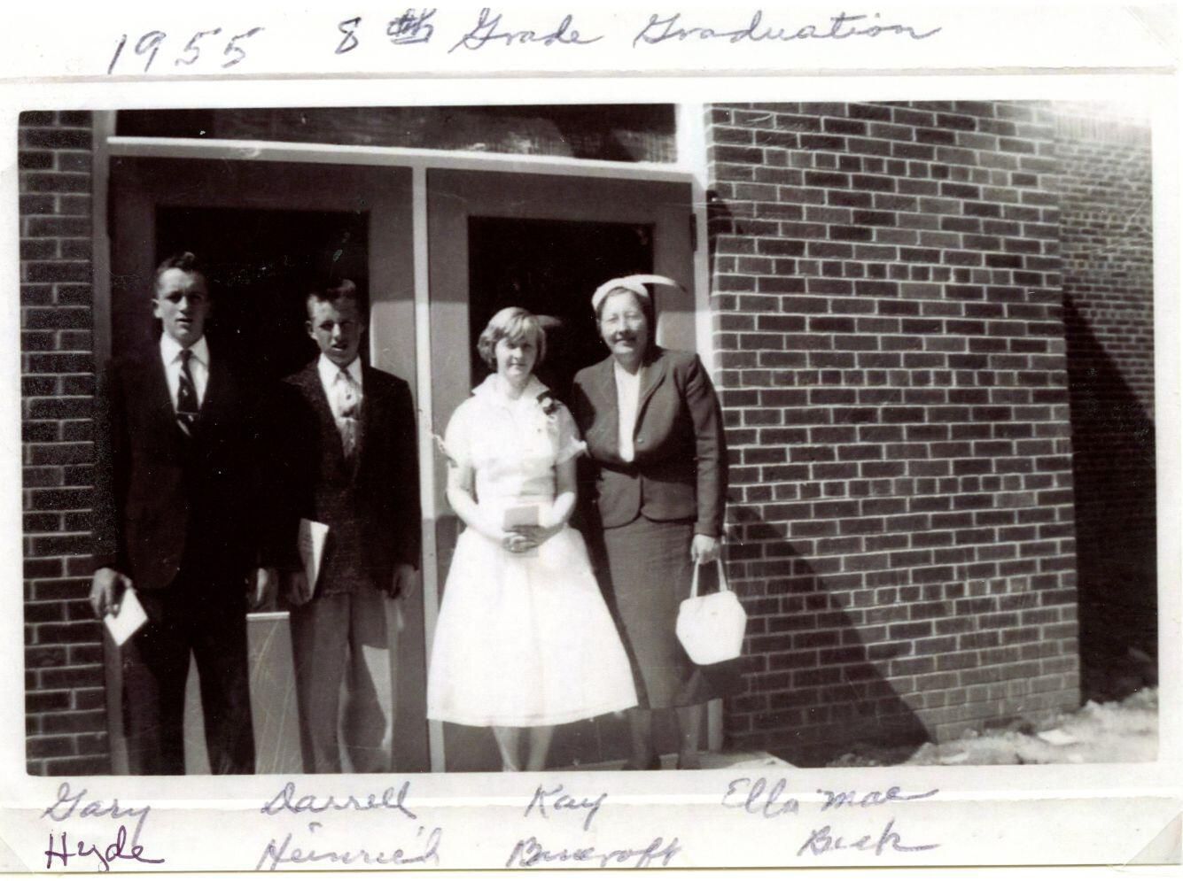 Union Home School 1955 8th grade graduates. Gary Hyde, Darrell Heinrich, Kay Bancroft, Ella Ma Beck (teacher).
