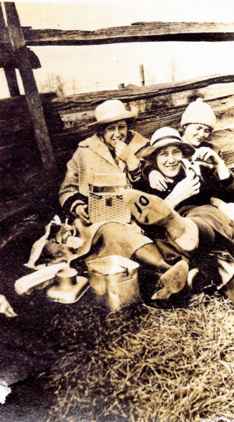 Altha Lawhead and two friends taking a lunch break while working at Vaughn Seed Company in Ovid.