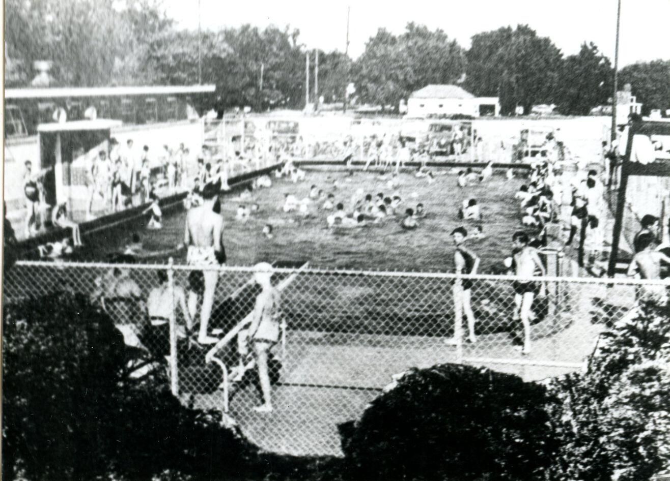 Veterans' Memorial Pool, St. Johns, early 1950's. From National Bank (later Municipal Building) mural. Copy of photo used in Clinton County History (1980) page 750.