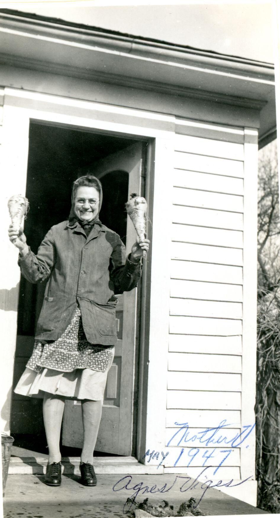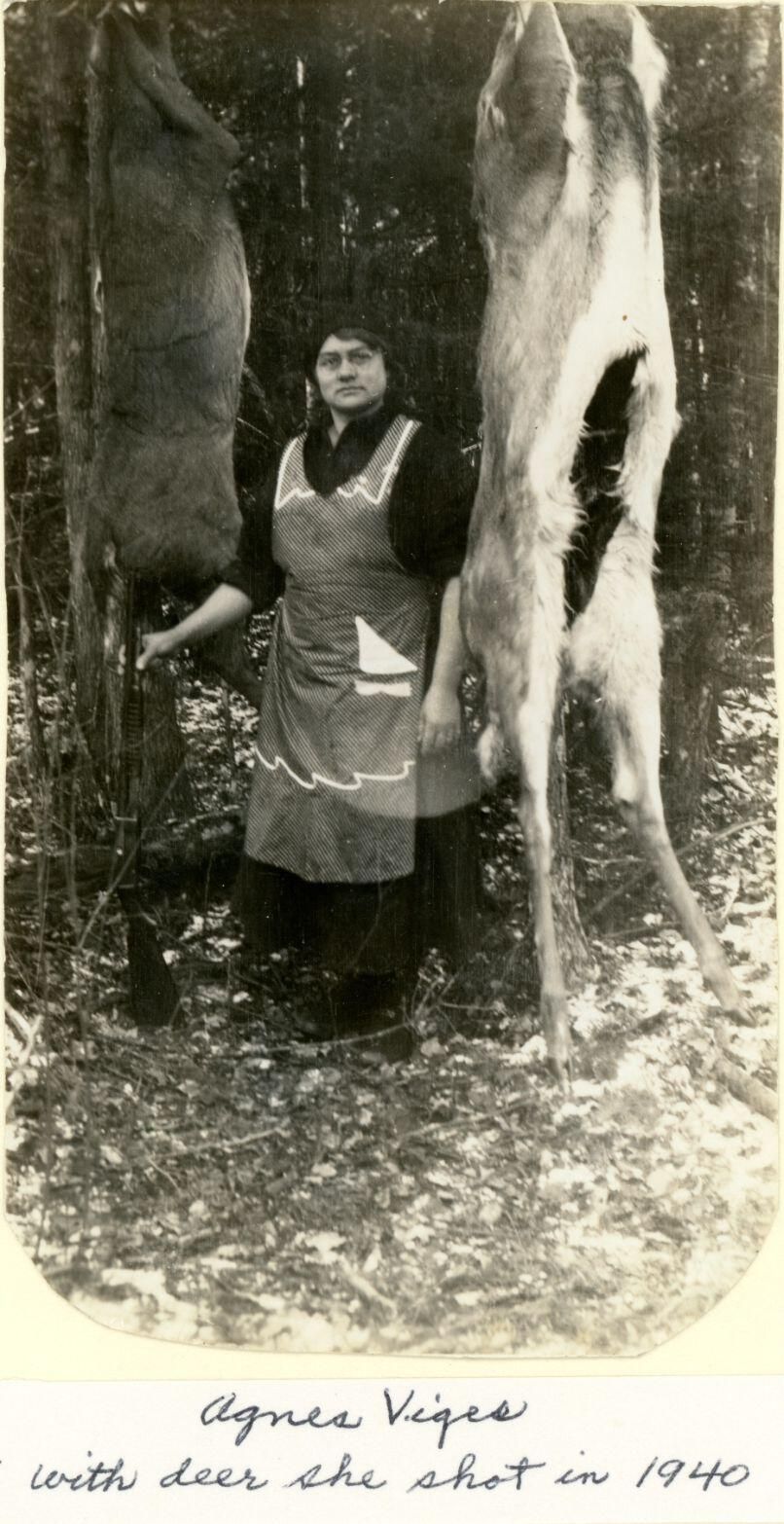 Agnes Viges standing in doorway in 1947 and with deer she shot in 1940.