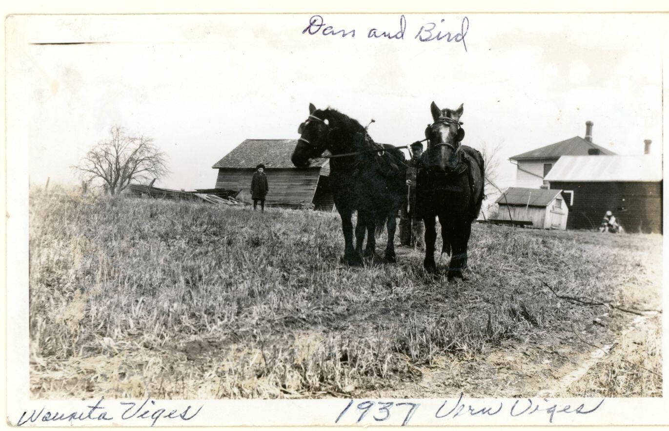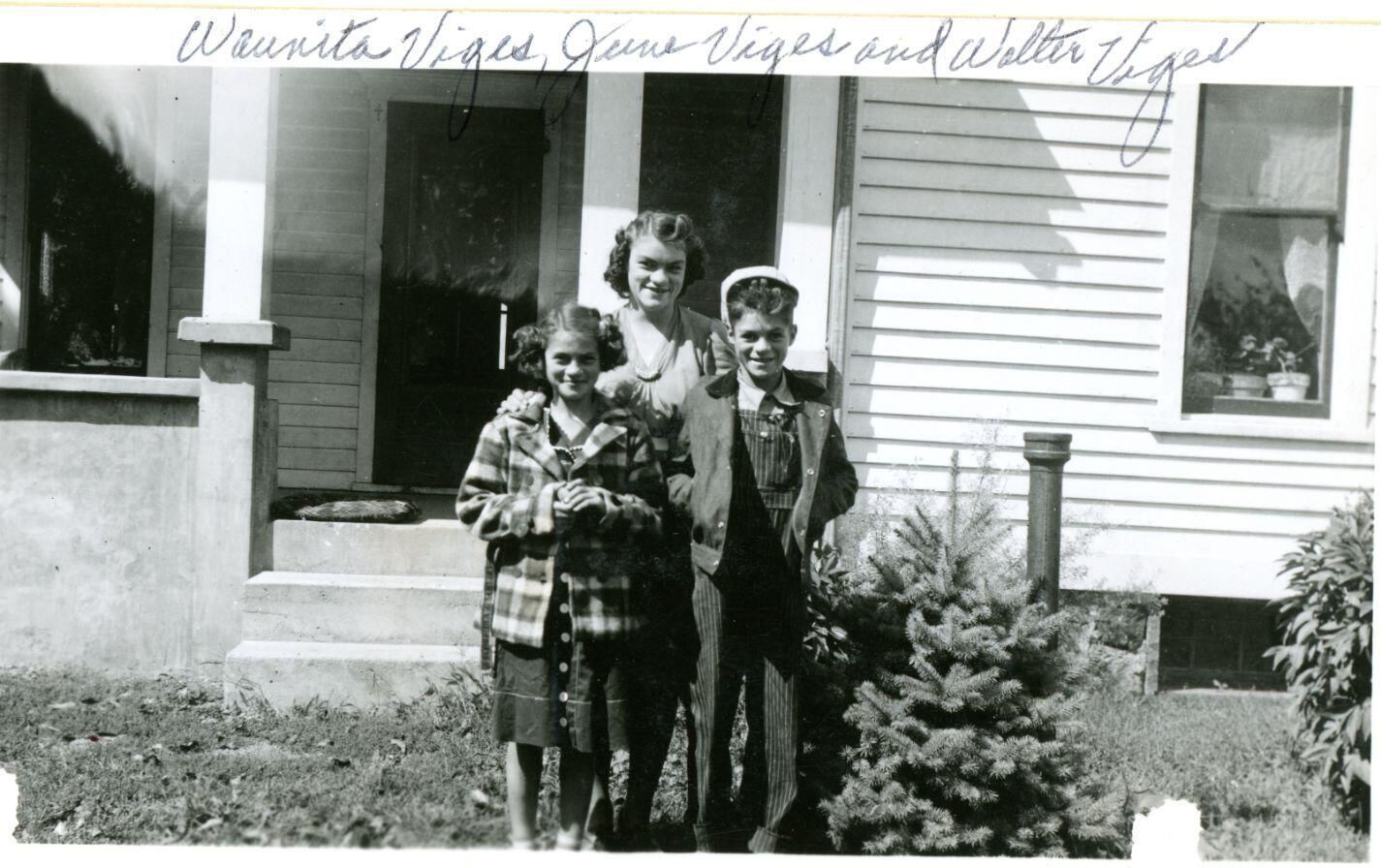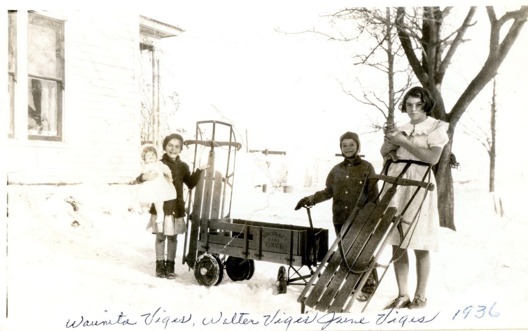 Waunita, June, and Walter in front of house and playing in snow. Waunita and Vern with horses.