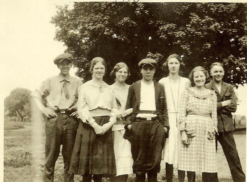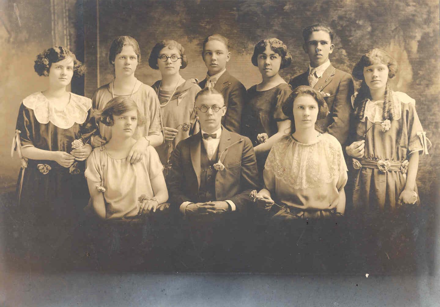 Wacousta High School class of 1923 (10th grade). (front) Margaret Andrus Hallock, John W. Seely (principal), Lucille Stone Greenfield, (back) Winifred Parks Hahn, Dora Daniells Pawchik, Pauline Merrill Puetz, Franklin Waldron, Lula Hart Hammond, Robert Hill, Opal Parks Flegler. digital scans