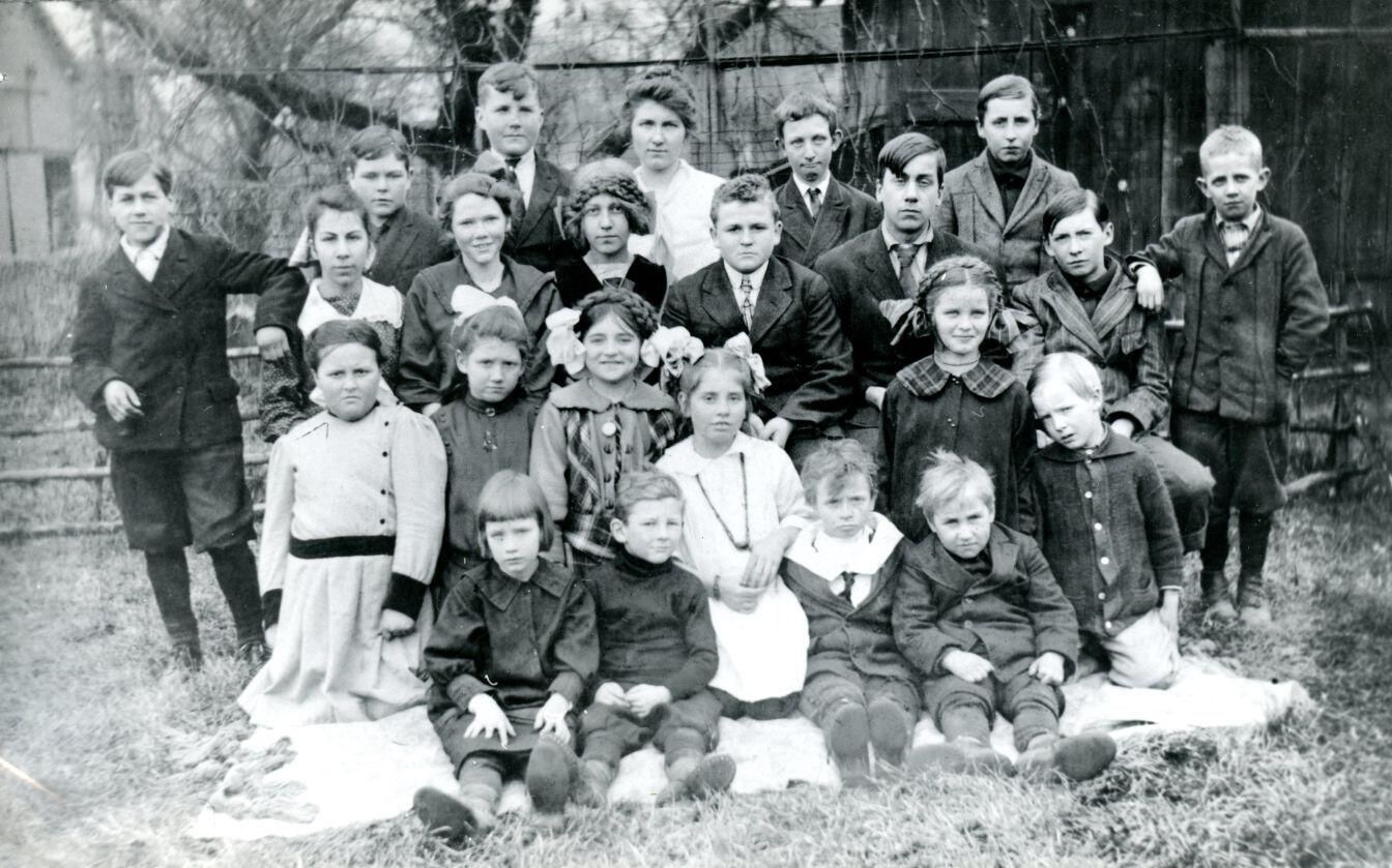 Watson School, Duplain Township, 1916. Orrie Scott, George Walker, Lawrence Watson, Ms Nellie Holbrook (teacher), Glen McKarney, Cecil Langham, Robert Smith, Alice Scott, Ella Northrup, Glenn Day, Glenn Scott, Dallas Langham, Leona Davis, Neva Armstrong, Charlotte Stevens Chapman, Neva Bryant Keys, Ora Langham, Alice Ellinger, Dorothy Bryant Kasper, Deane/Diane Fizzell, Joseph Stott, Alvin Scott. Copy of postcard