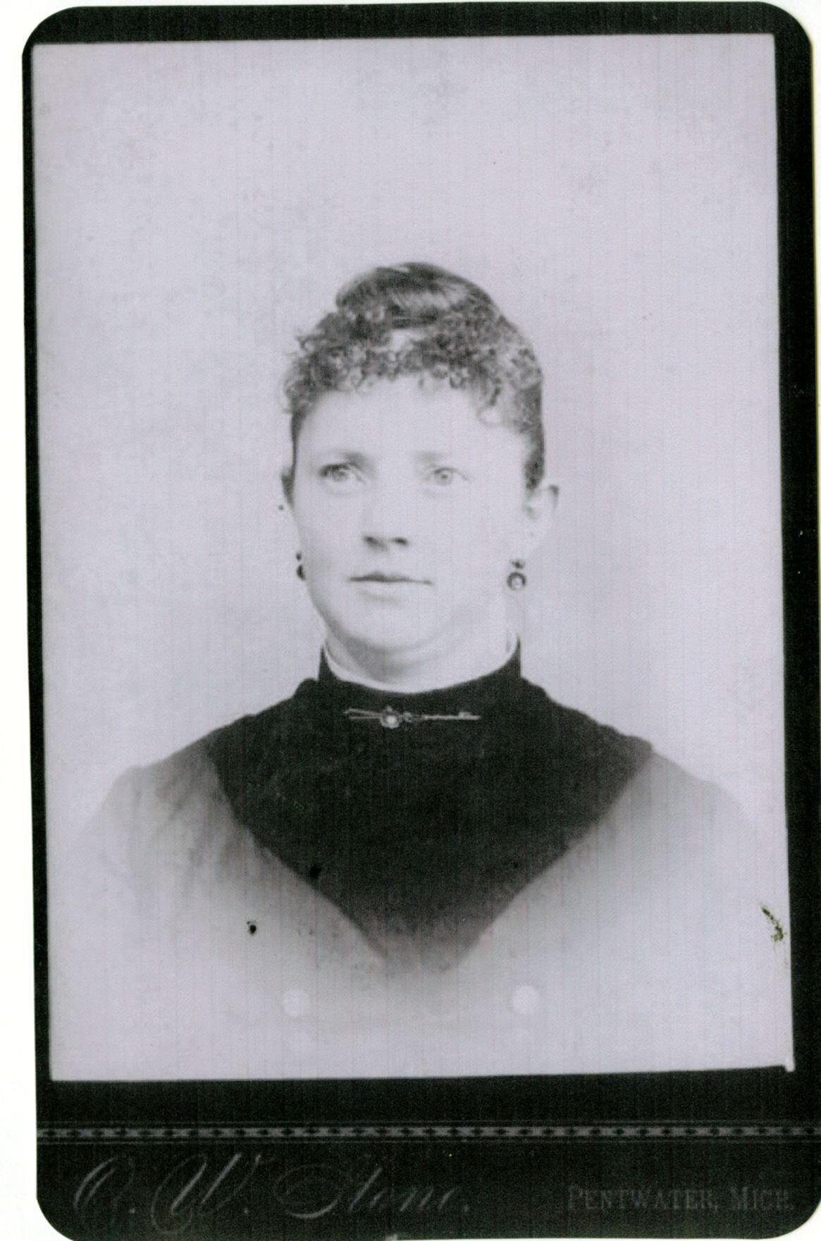 Susan A. (Connell) Wickham, wife of DeWitt Clinton Cornelius Wickham. Photocopy of a cabinet card taken at Pentwater, Michigan.