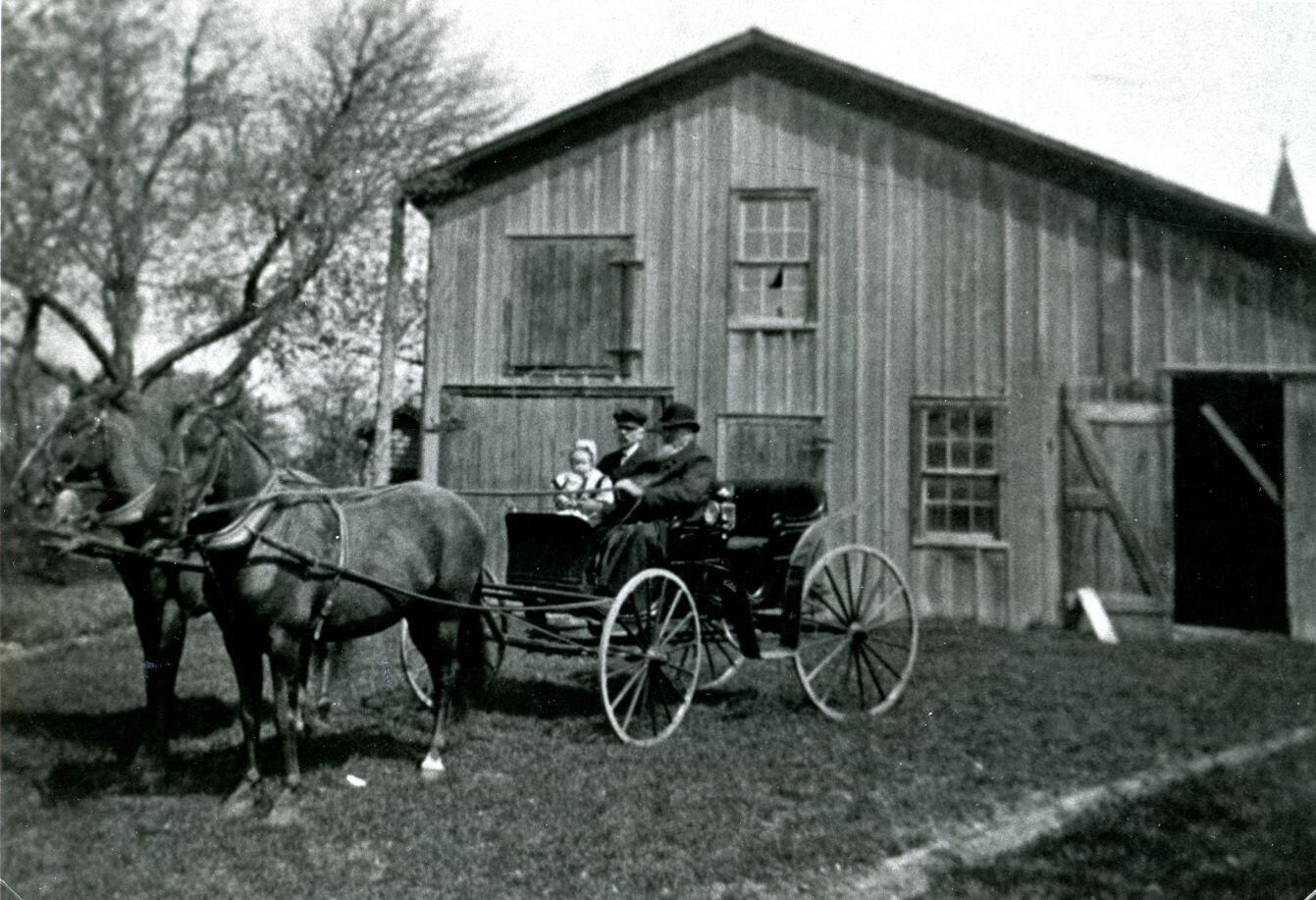 Rodney B. Wilson with granfather, Cooley Ball and great-grandfather Kipp in front of barn west of the Wilson home. Copy of photo used in Clinton County History (1980) page 745. Original photo owned by Briggs Library, St. Johns.