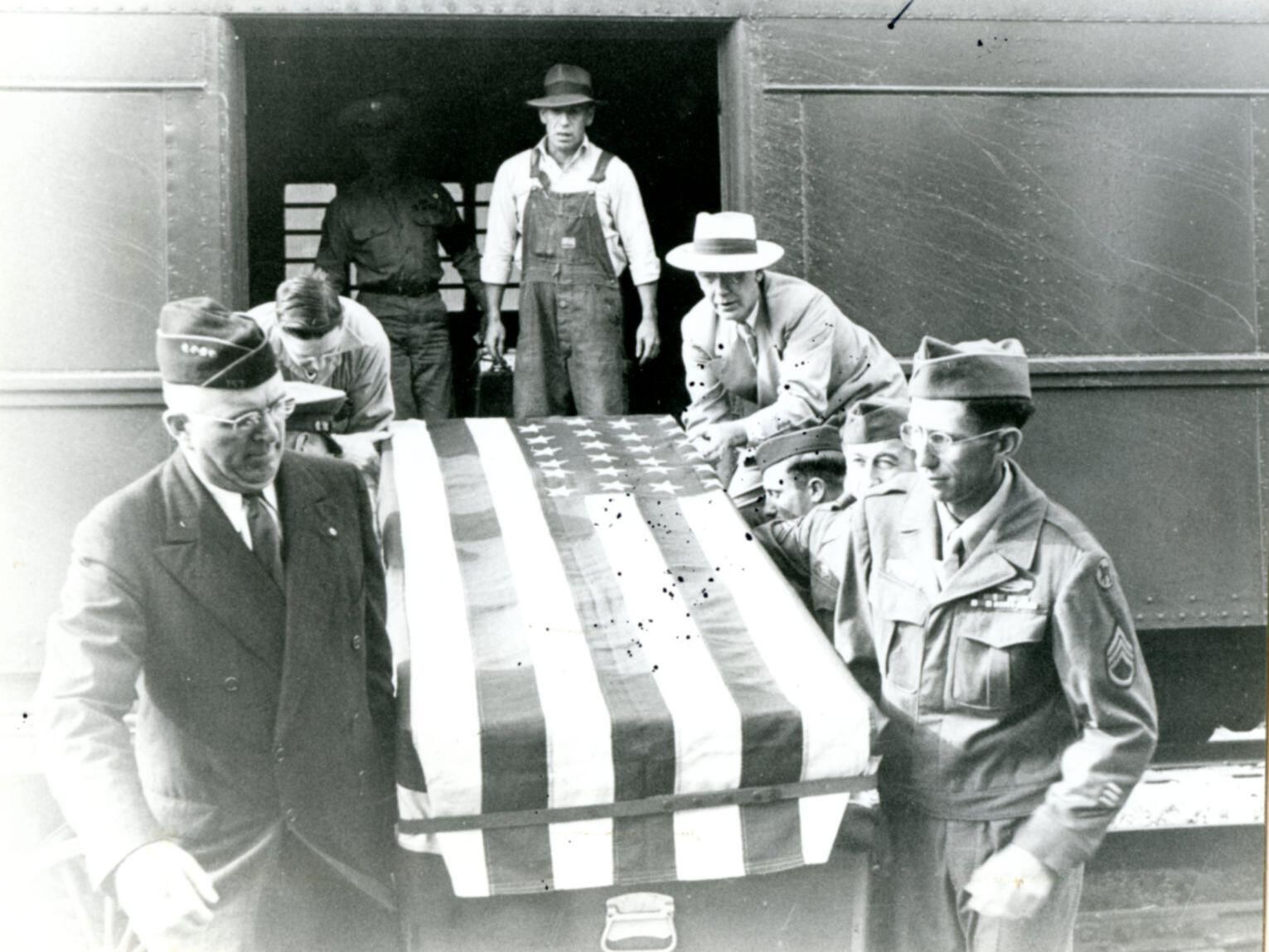 Body of fallen World War II soldier being unloaded from train at St. Johns.