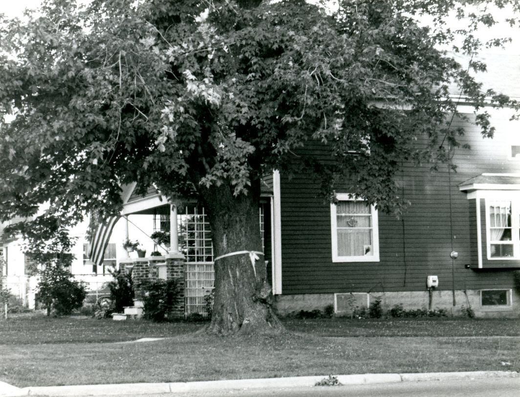 Showing support for American hostages held in Iran residents of the 100 block of S. Oakland tie yellow ribbons around trees in 1980. Copy of photo used in Clinton County History (1980) page757. Additional copy PI212-176.