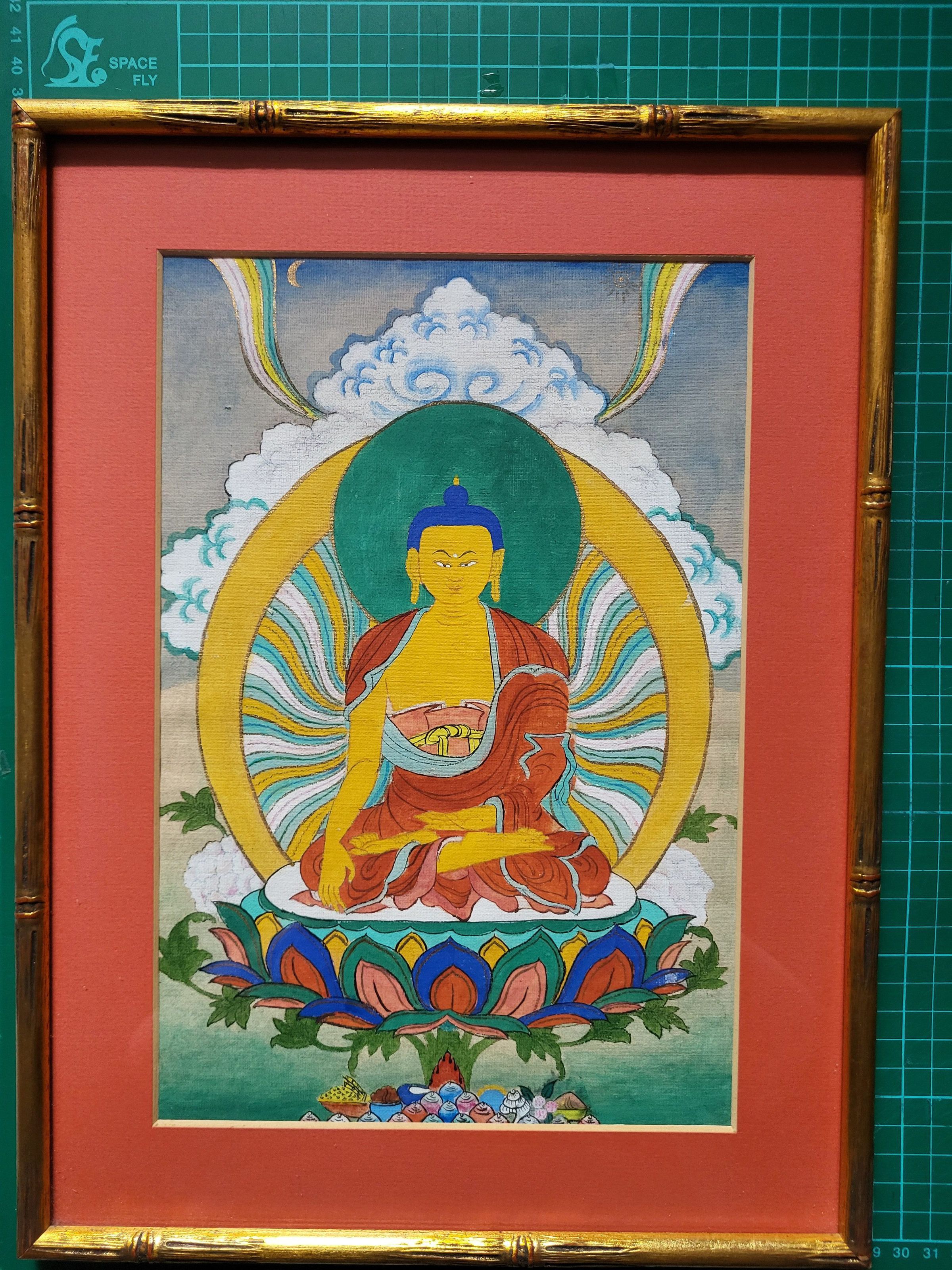 This painting of Shakyamuni Buddha was given to Jyoti Dharma by Kalu Rinpoche (date unknown), as confirmed by Brian Harris. Professionally framed with glass cover and gold-coloured metal frame.