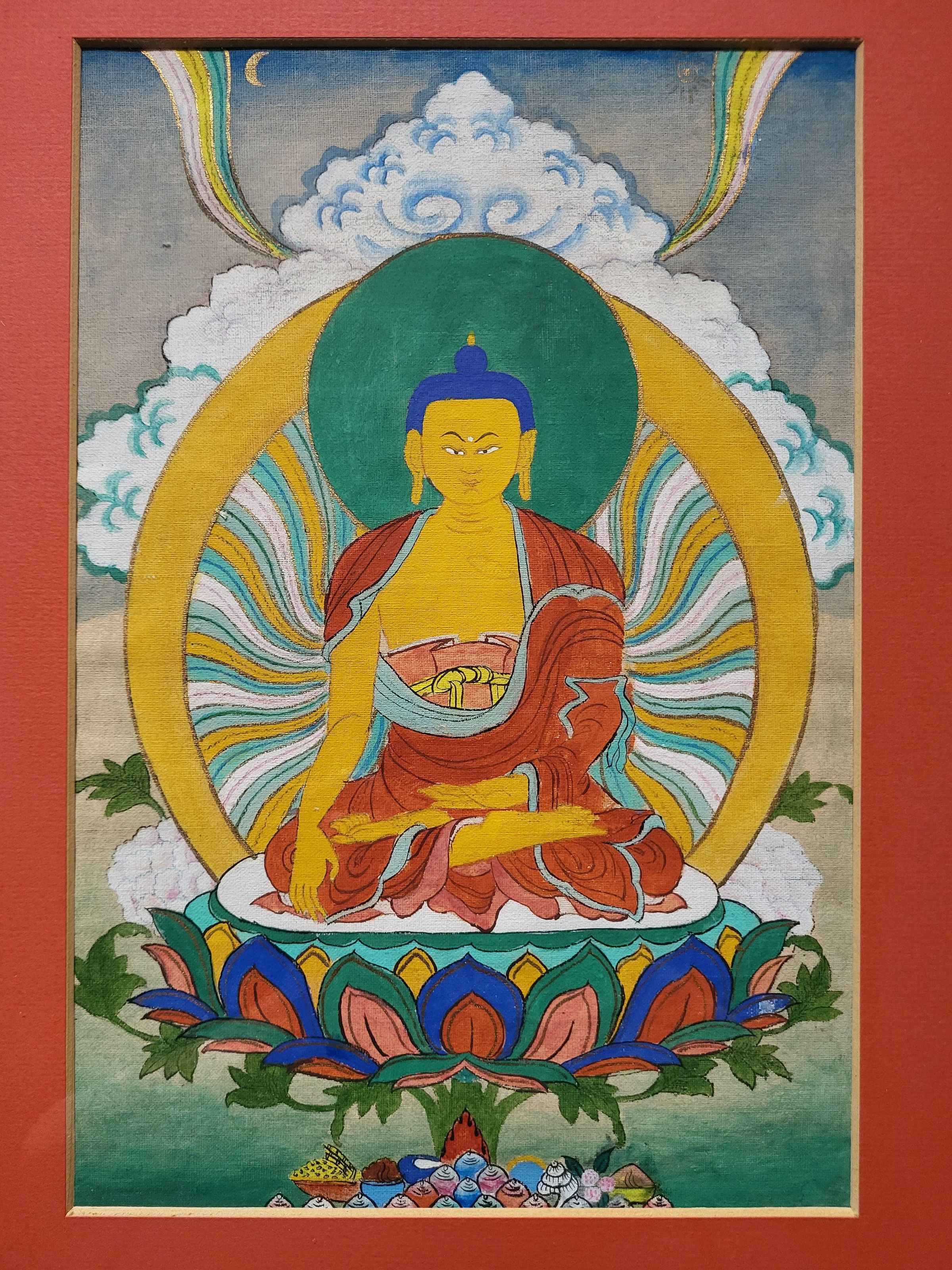 This painting of Shakyamuni Buddha was given to Jyoti Dharma by Kalu Rinpoche (date unknown), as confirmed by Brian Harris. Professionally framed with glass cover and gold-coloured metal frame.