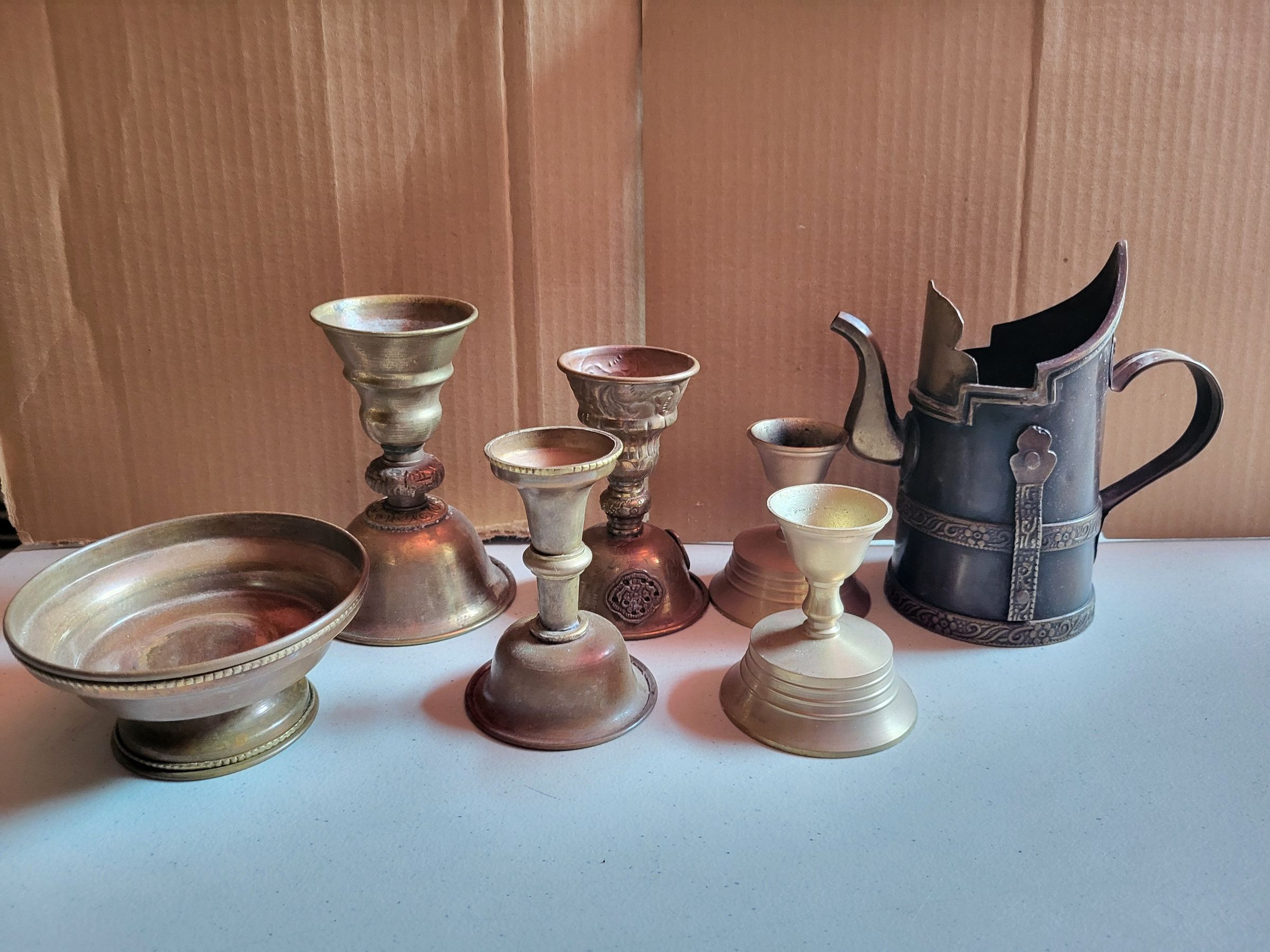 Five butter lamps, pitcher, and dish
