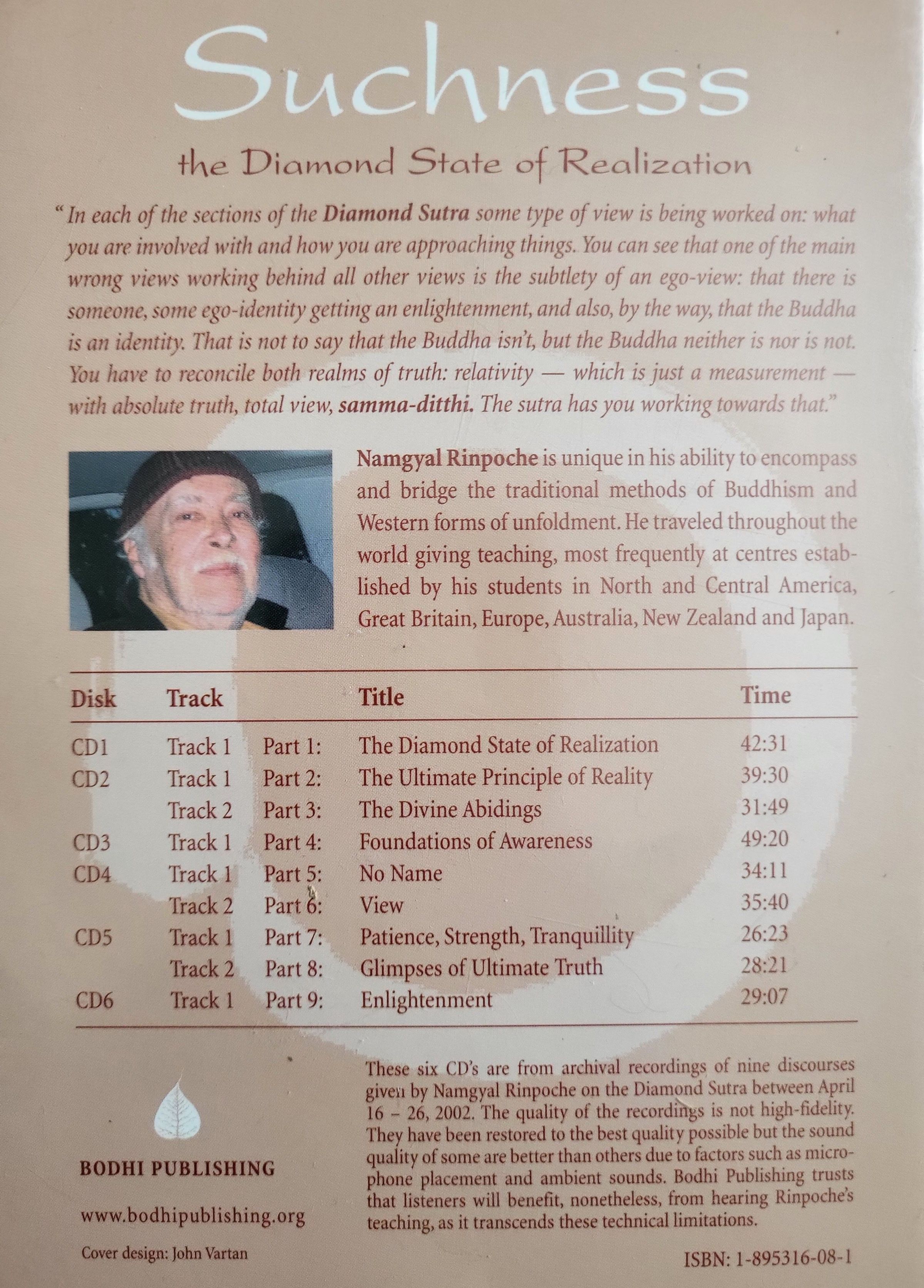 These six CDs are from archival recordings of nine discourses given by Namygal Rinpoche on the Diamond Sutra between April 16-26, 2002.Audio Format