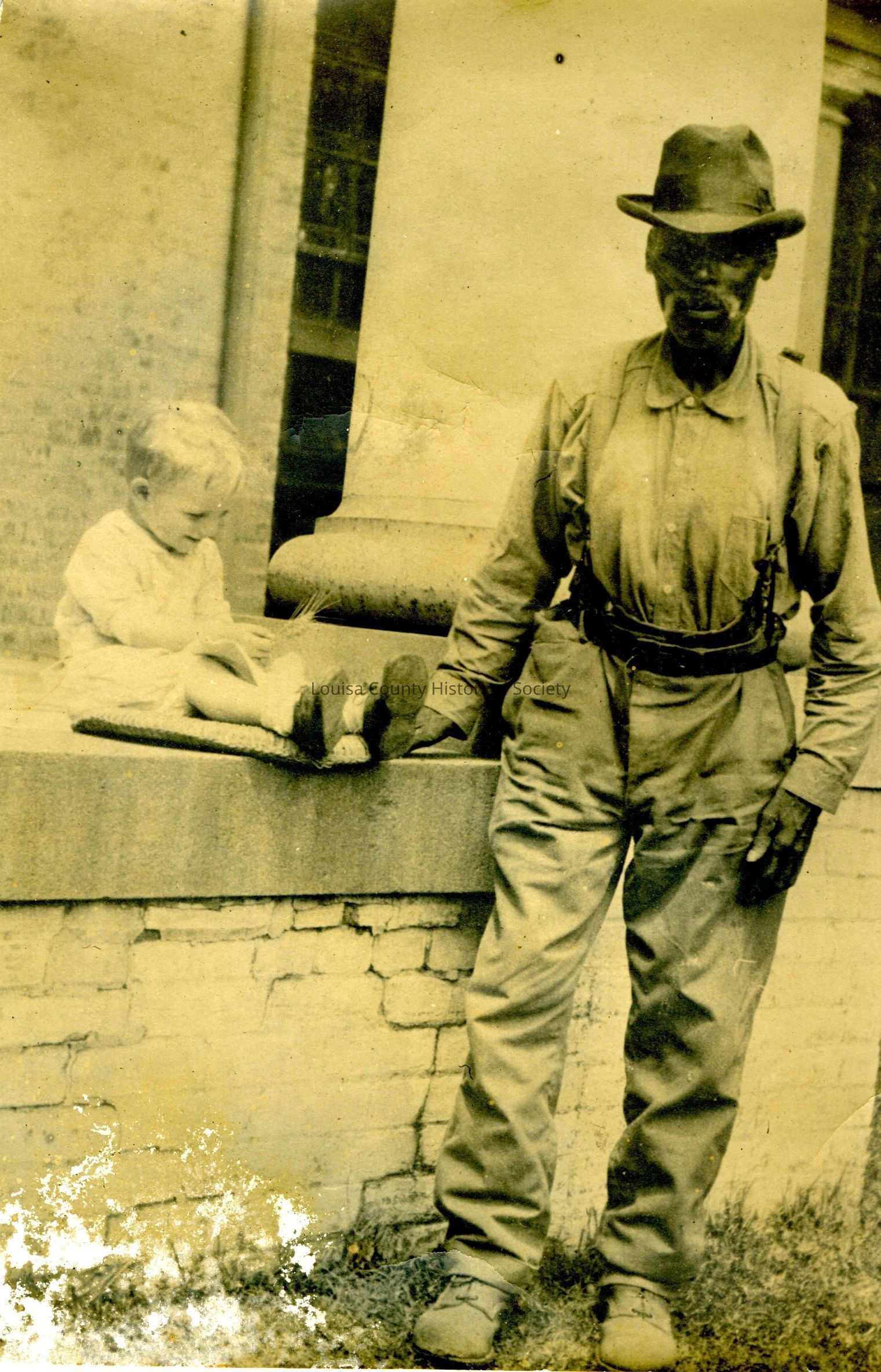 Photograph of black man standing and white child sitting