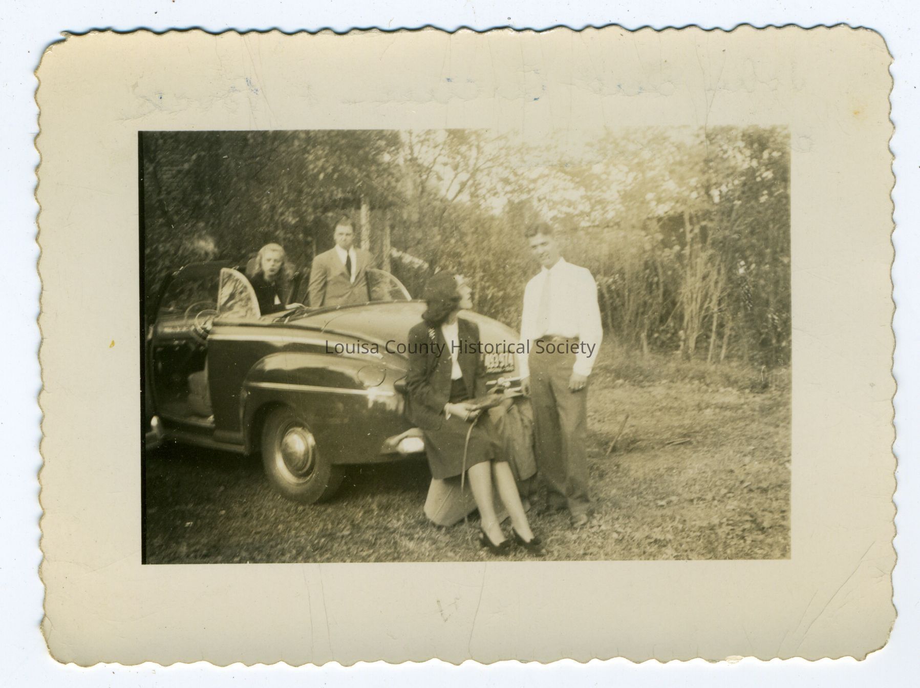 Photograph of two couples - one couple sitting in car and the other in back of the convertible