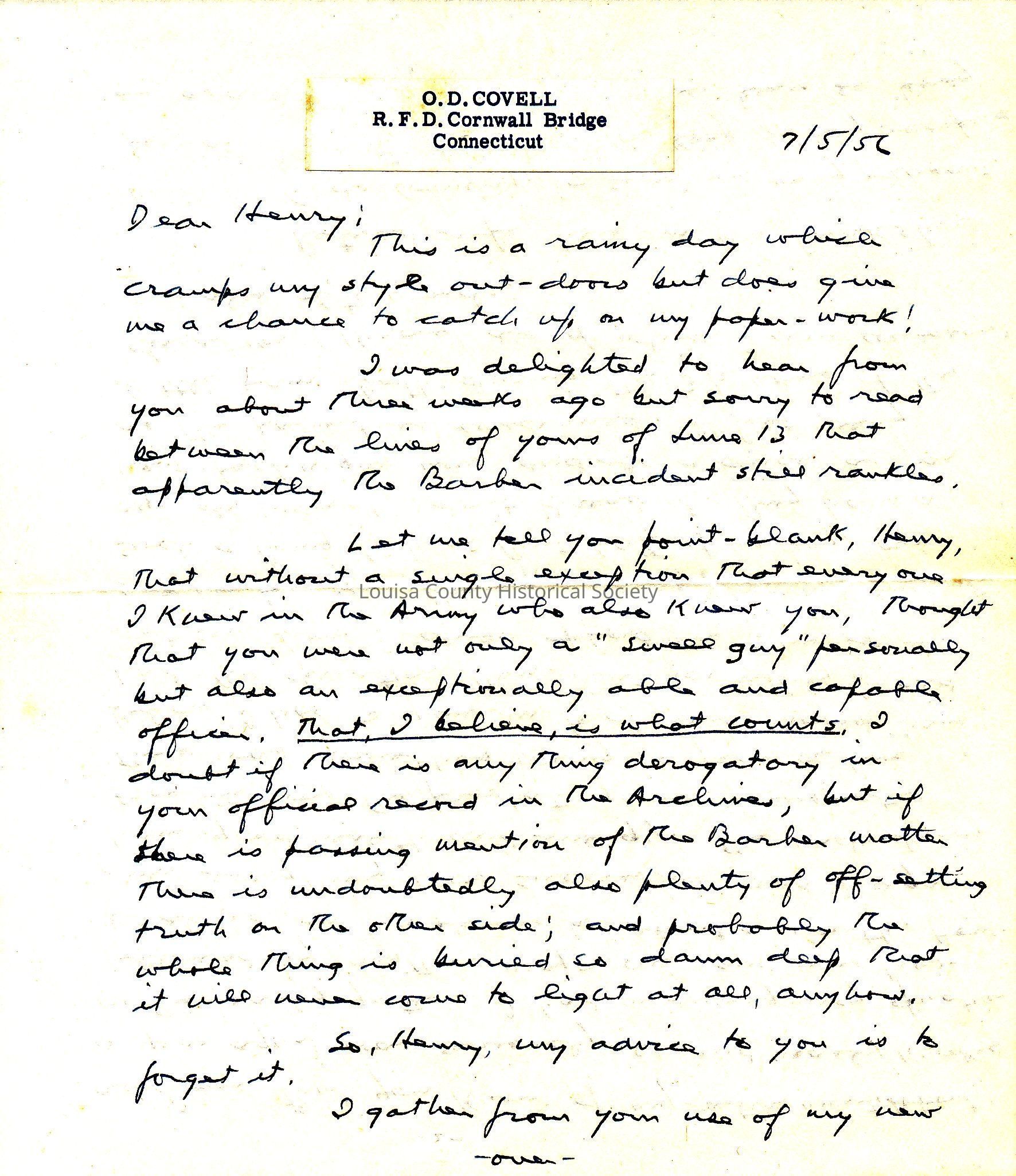 Letter from O.D. Covell at R.F.D. Cornwall Bridge, CT to Henry Taylor in Richmond, VA dated 7/5/1956