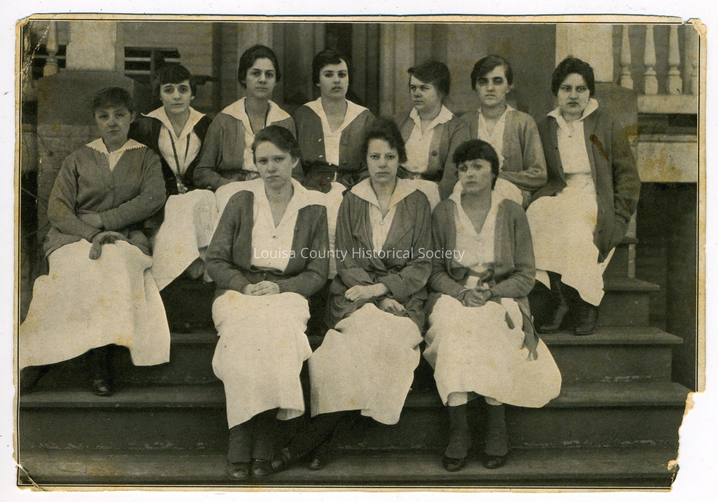 Photograph of 10 nurses sitting on the steps in front of a house