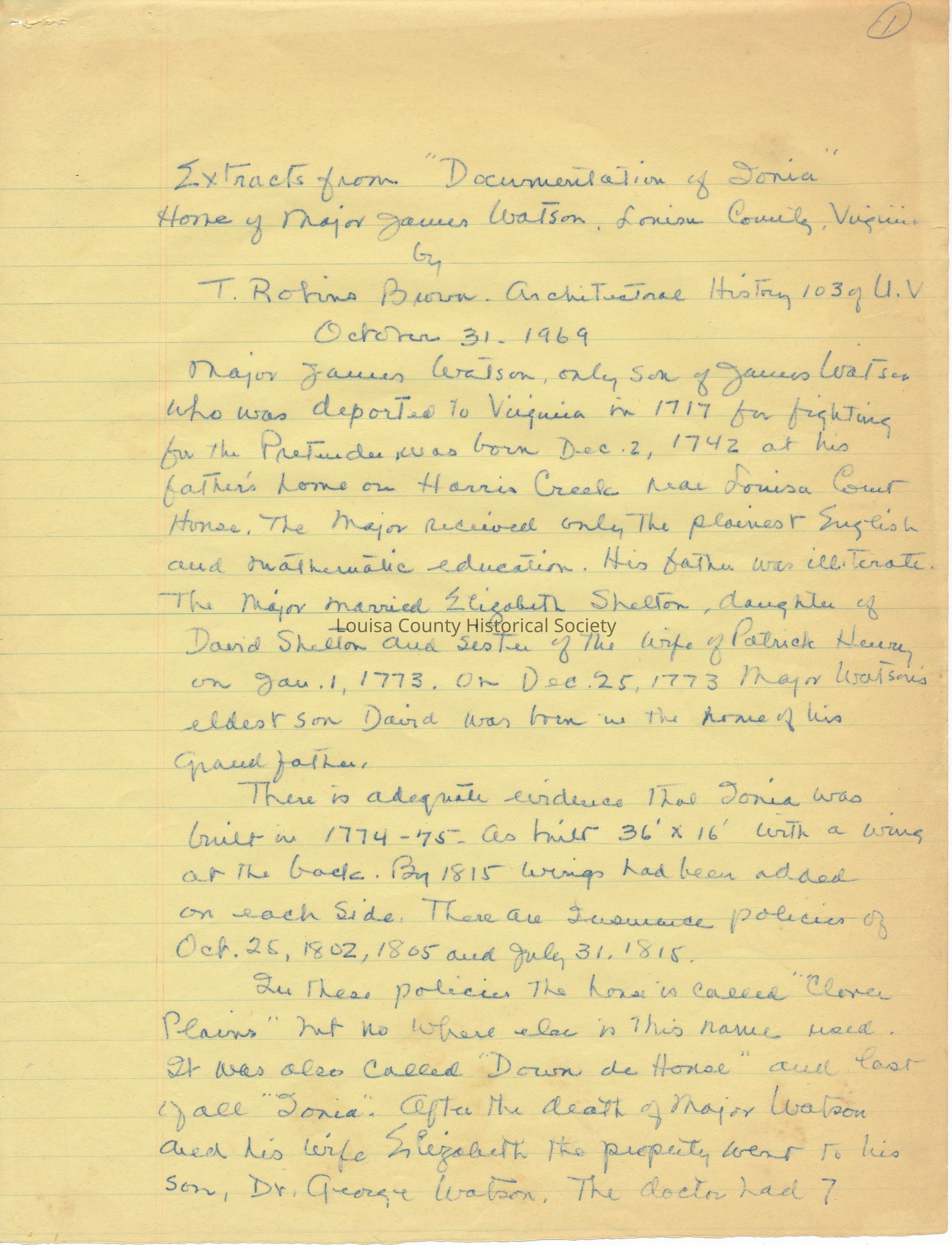 Extract from "Documentation of Ionia" Home of Major James Watson, Louisa County Virginia" by T. Robins Brown Architectural l History 10/31/1969Entry/Object ID