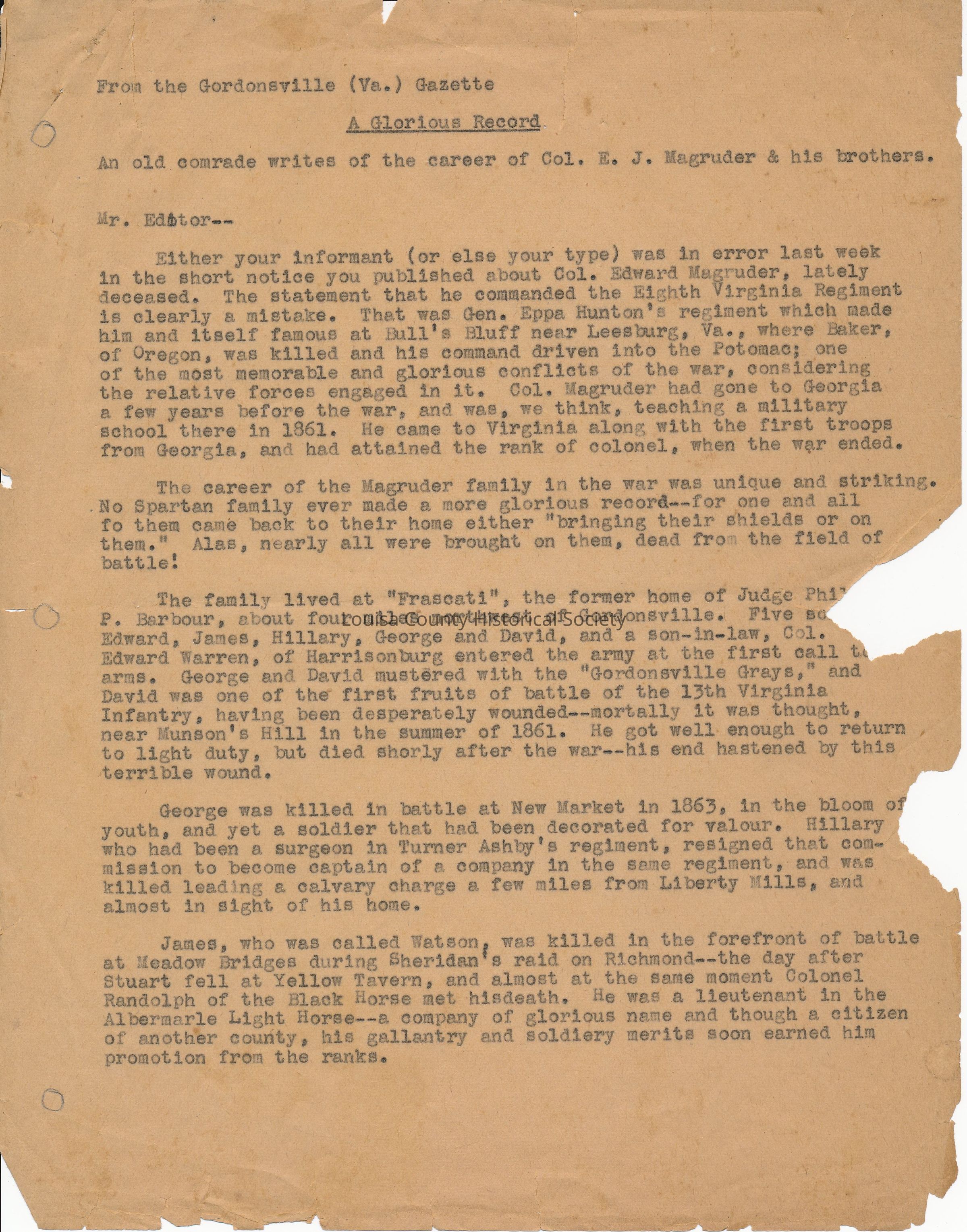 Gordonsville (Va.) Gazette Letter to the Editor regarding career of Col. E.J. Magruder by W.W. Scott