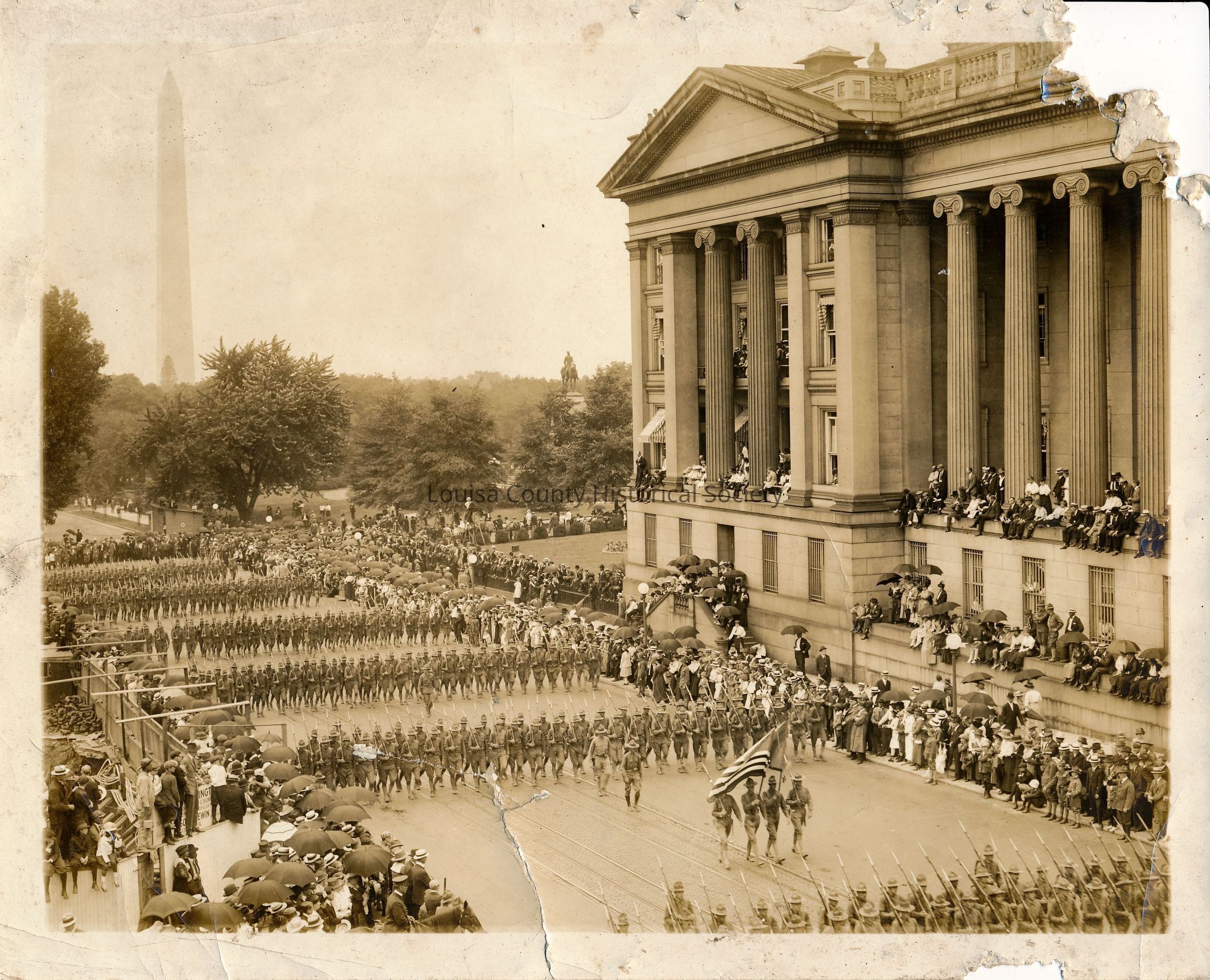 Photograph of a military parade with Washington Monument in the background