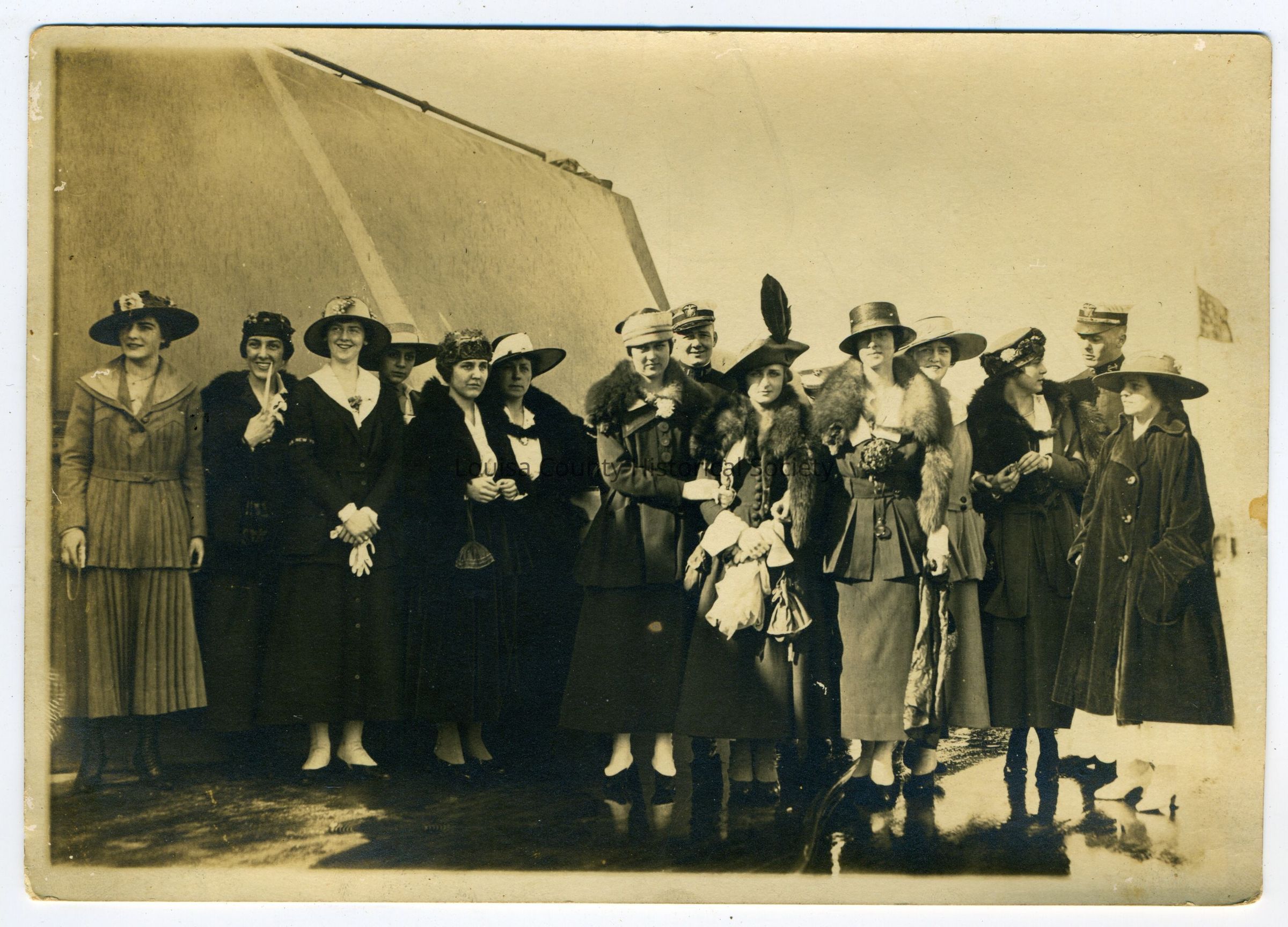 Photograph of a group consisting of 12 women and 2 military men, all wearing hats next to an embankmentEntry/Object ID