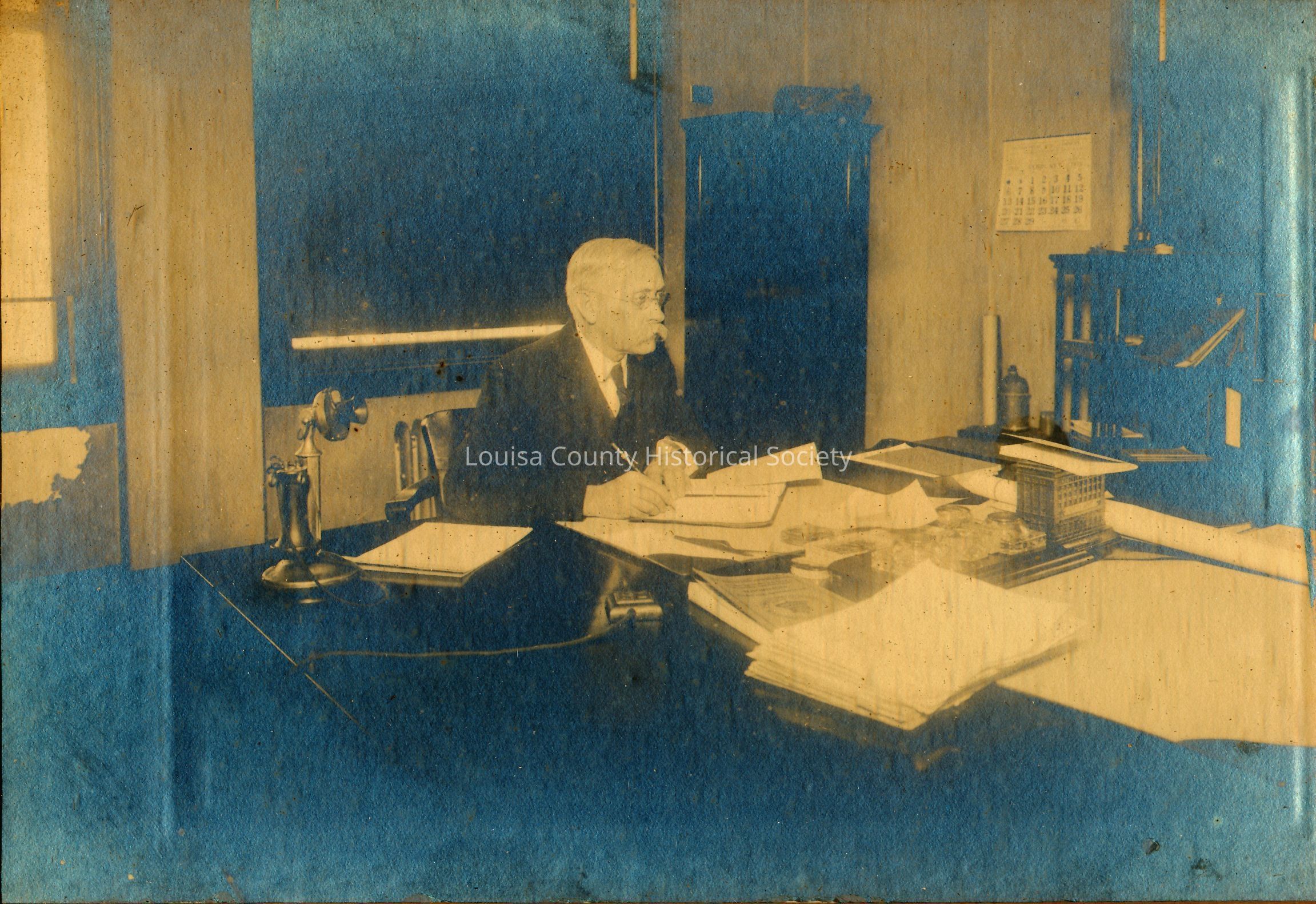 Photograph of a man with mustache in an office working at a desk