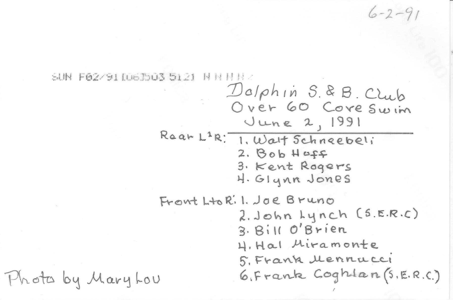 Over 60 Cove Swim 1991: Standing Schneebeli, Hoff, Rogers, Jones, Seated Bruno, John Lynch (SERC), O'Brien, Miramonte, Mennucci, Frank Coghlan (SERC)Subject Person or Organization