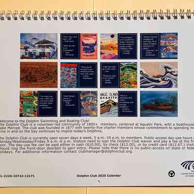 Calendar on sale to members. Most months feature a poster for a swim or regatta, but some months feature artwork from trinkets (August and December, one painting (January) and an 1894 picnic invitation (May).