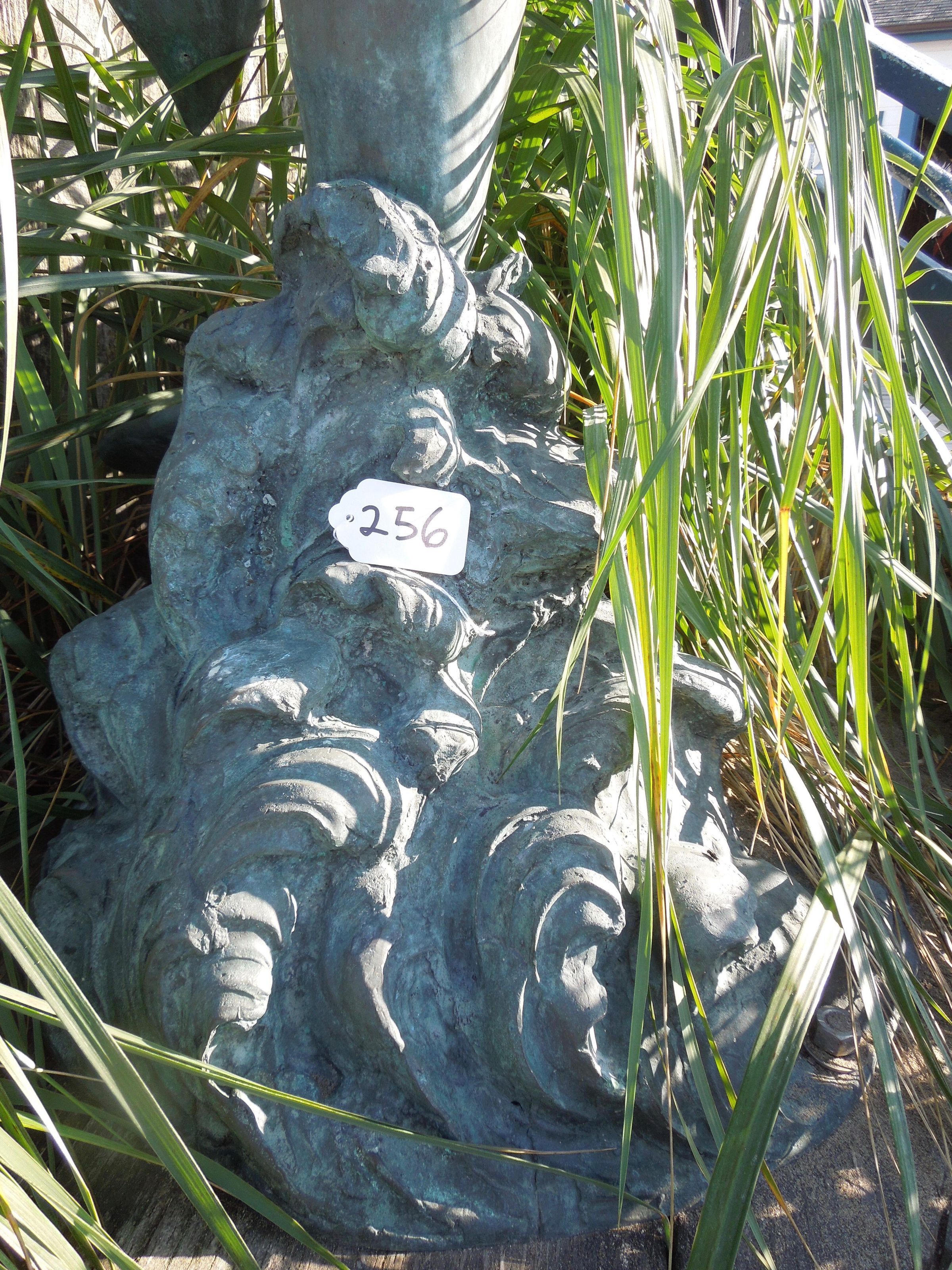 Bronze (maybe) sculpture of two dolphins rising from the water, set on base that looks like churning waves. Initially installed November 2001. Original plaque replaced in 2003. See research notes below.