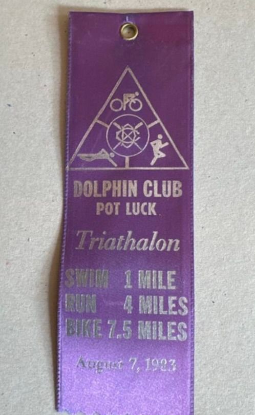 Text in silver print: A triangle with crossed oars logo in center with a bicyclist on top point, a swimmer on left corner point, and a runner on right corner point - Dolphin Club - Pot Luck - Triathlon - Swim 1 Mile - Run 4 Miles - Bike 7.5 Miles - August 7, 1983