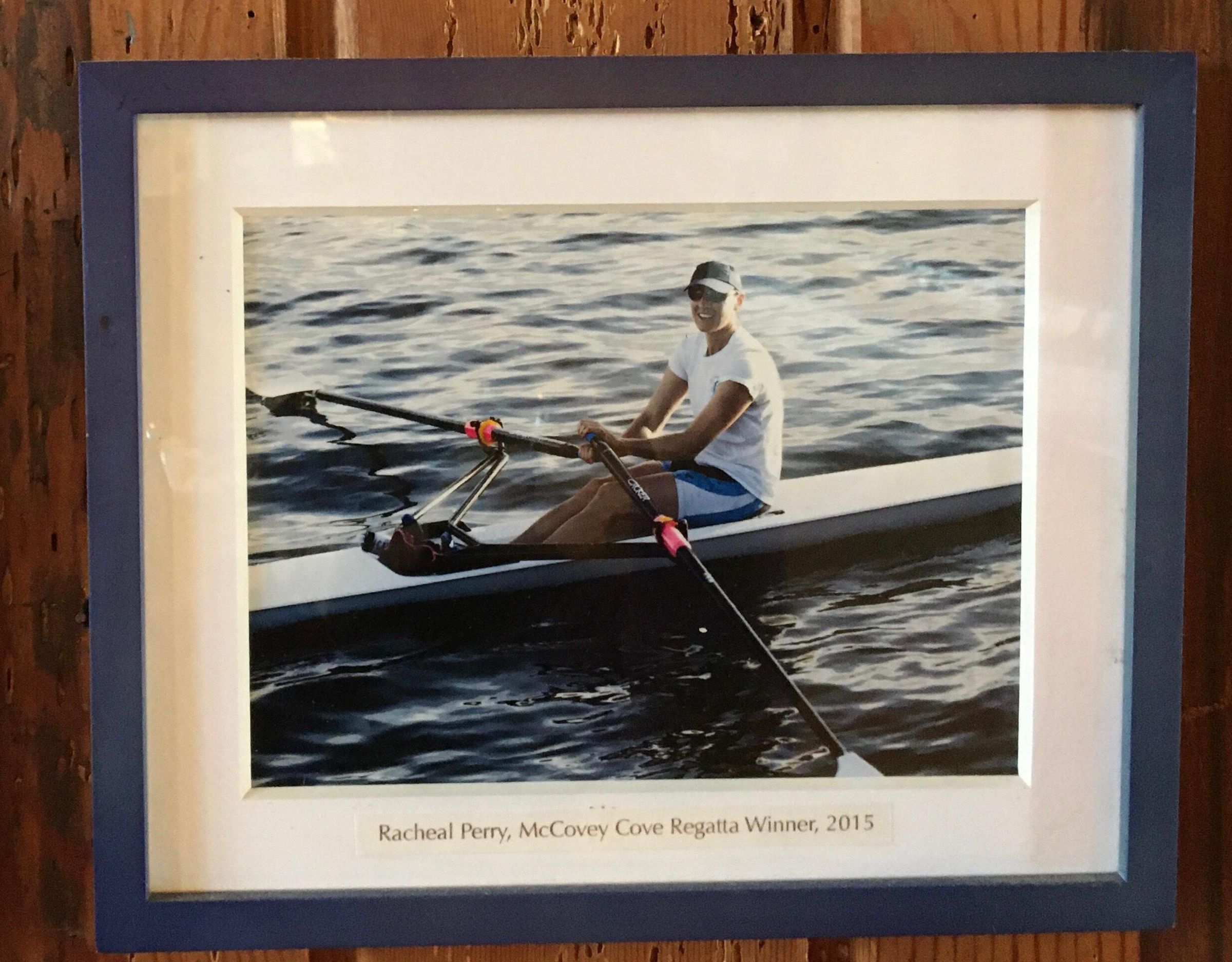 July 2020 was on west wall of main boathouse north of door to entry hall "Racheal Perry, McCovey Cove Regatta Winner, 2015"
