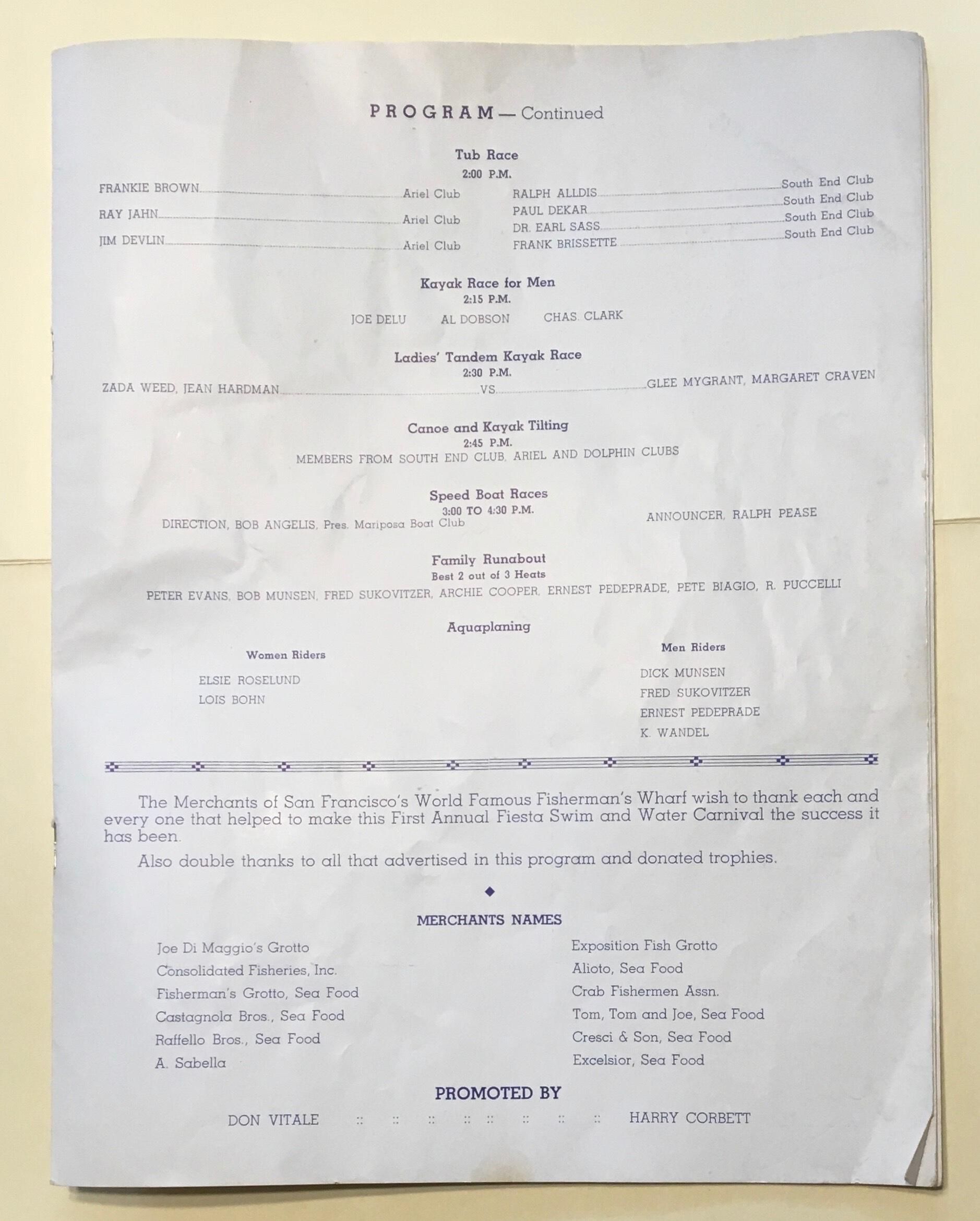 Souvenir program for "First Annual Fiesta - Water Sports & Distance Swim" to take place at Fisherman's Wharf, August 16-20, 1939. Sponsored by "Merchants of San Francisco's World Famous Fisherman's Wharf."