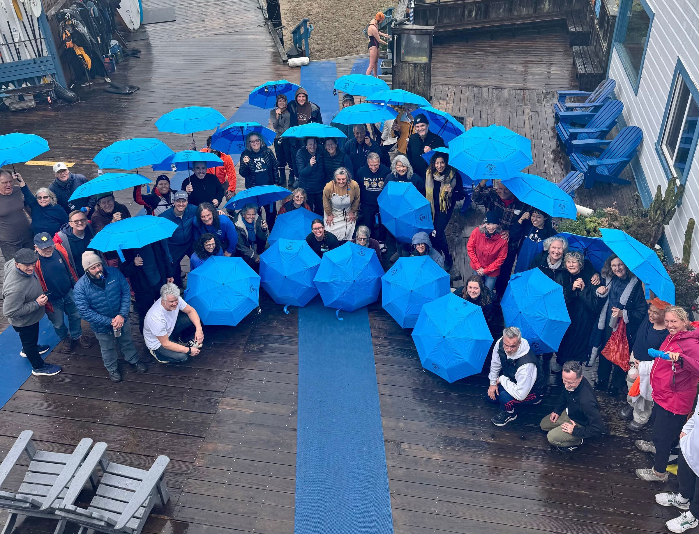 Blue folding umbrella given as trinket for 2025 Pier 41 Swim.