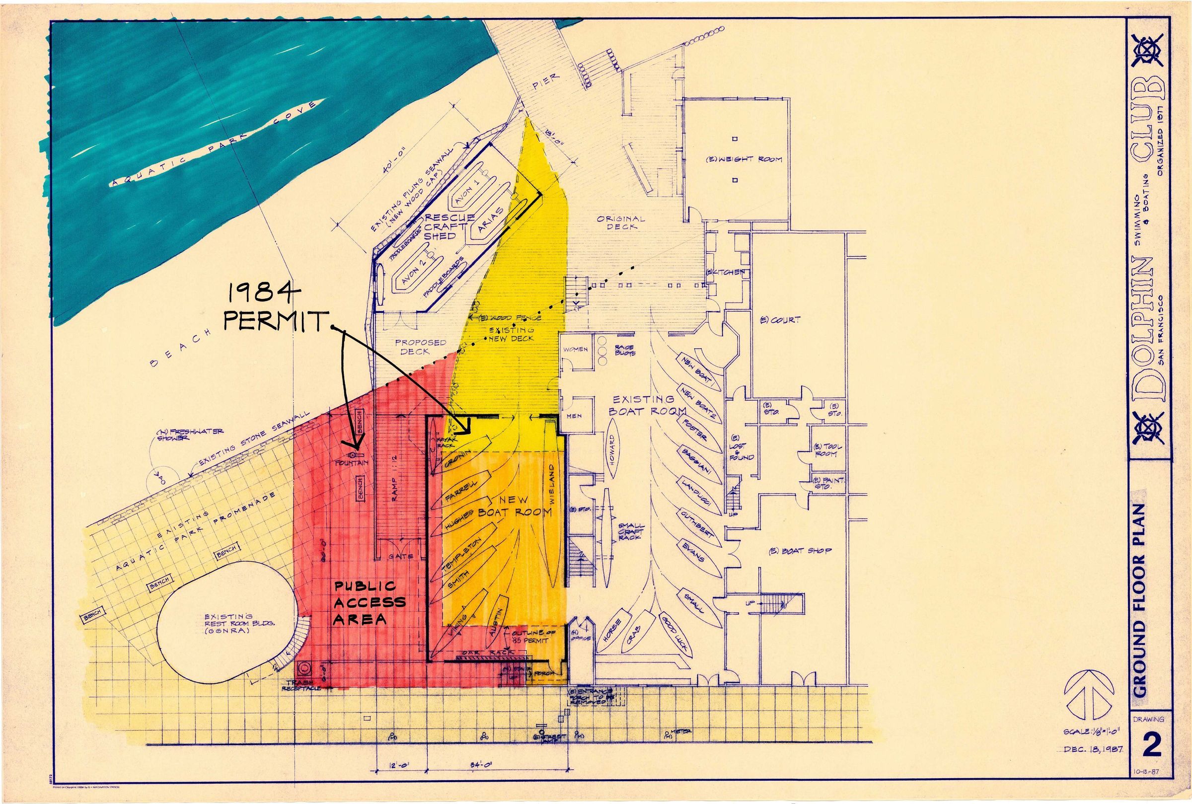 1 page plan of ground floor of Main Boat Room and New Boat Room. Color rendering of proposed boat arrangement in two rooms; locations marked for 20 + boats, each labeled with name of boat.Archive Details