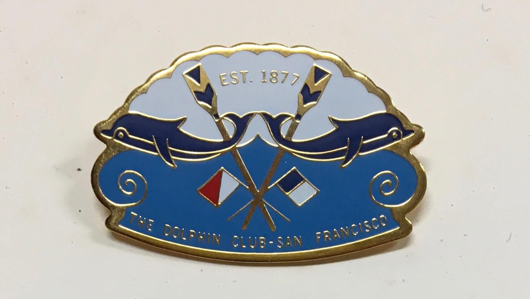 Roughly oval shaped pin with scalloped top edge, gold color edges. Design shows white sky, two navy blue dolphins tail to tail, crossed oars and two lats, bottom half is lighter blue. Text in gold lettering: On top: Est. 1877. On bottom: The Dolphin Club - San Francisco.Use