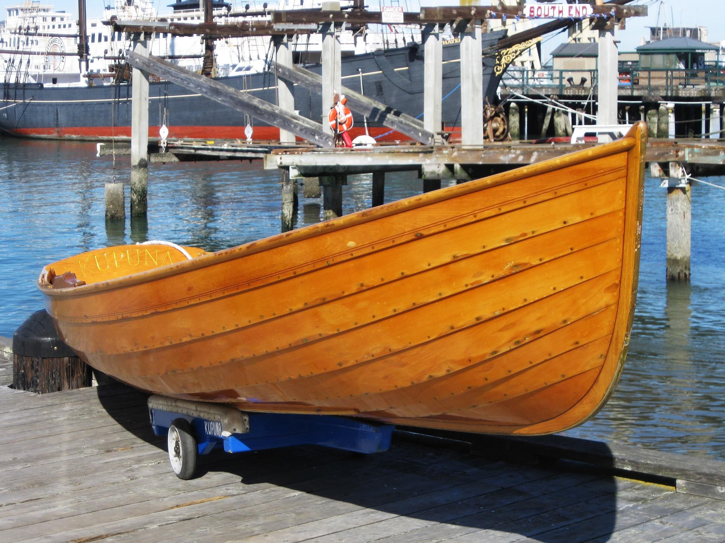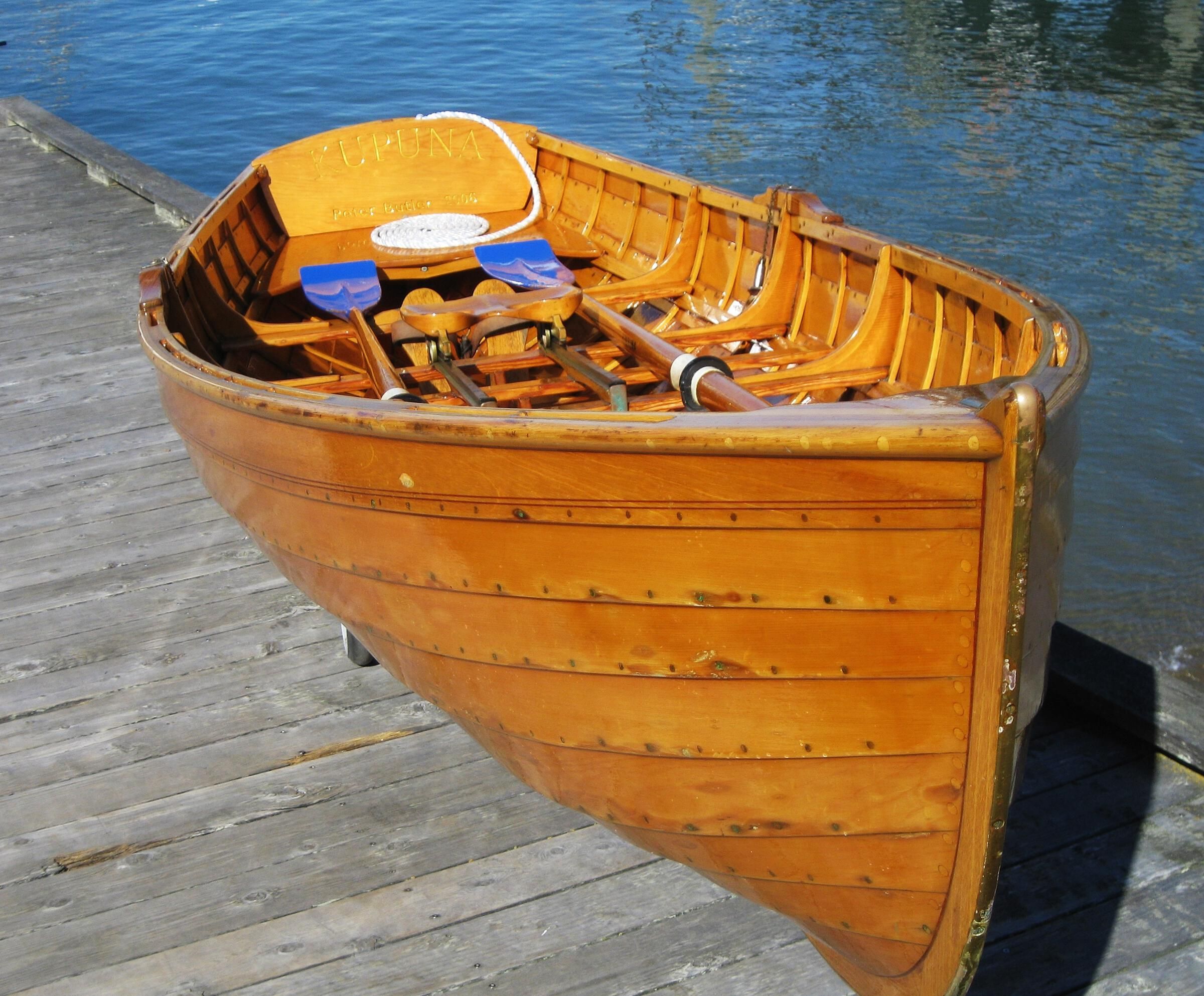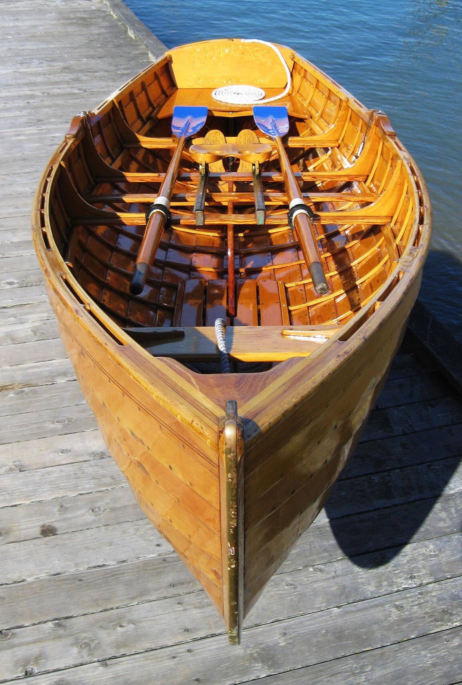 The wooden boat KUPUNA, a Dolphin Club Sliding-Seat Lapstrake Single.