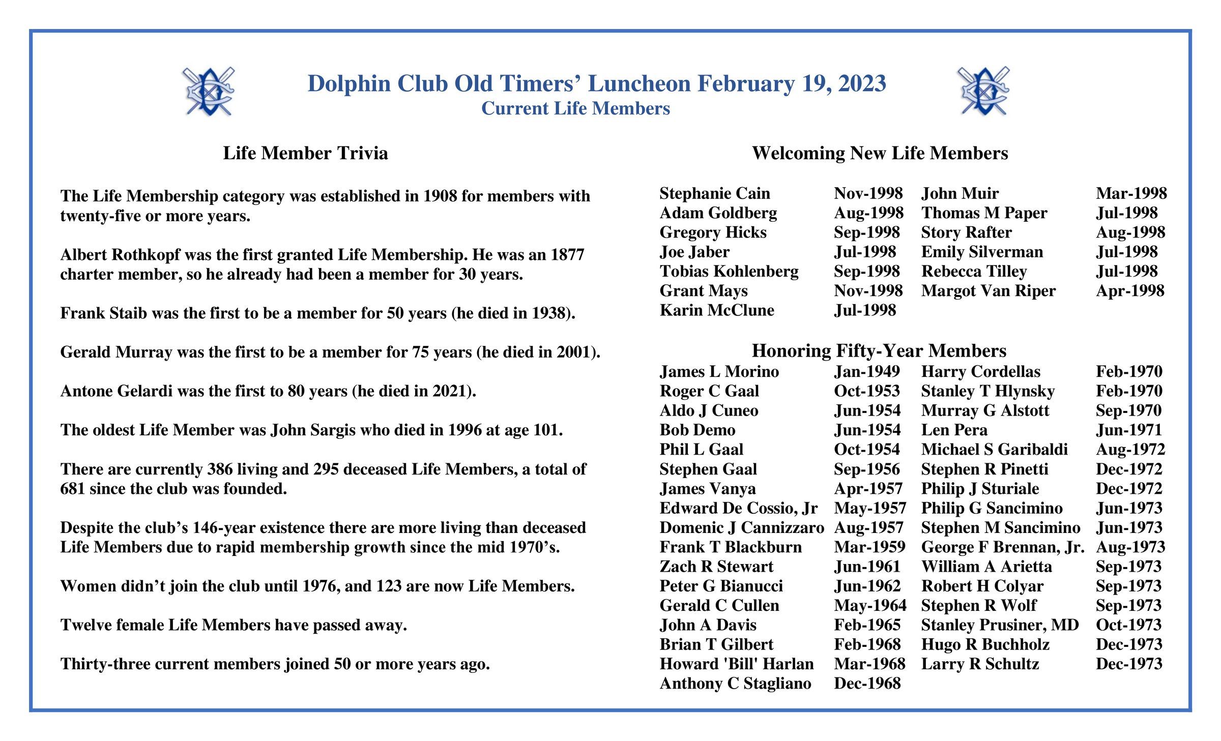 Two placemats: 1. Old Timer Trivia, new life members, 50+ year members. 2. Current life members 400+.Archive Details