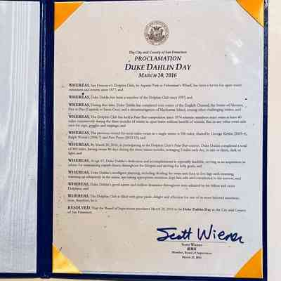 Blue leather bound City and County of San Francisco proclamation of March 20, 2016 as Duke Dahlin Day on the occasion of Duke's record setting 400 miles swim in Polar Bear swim winter of 2015-2016.