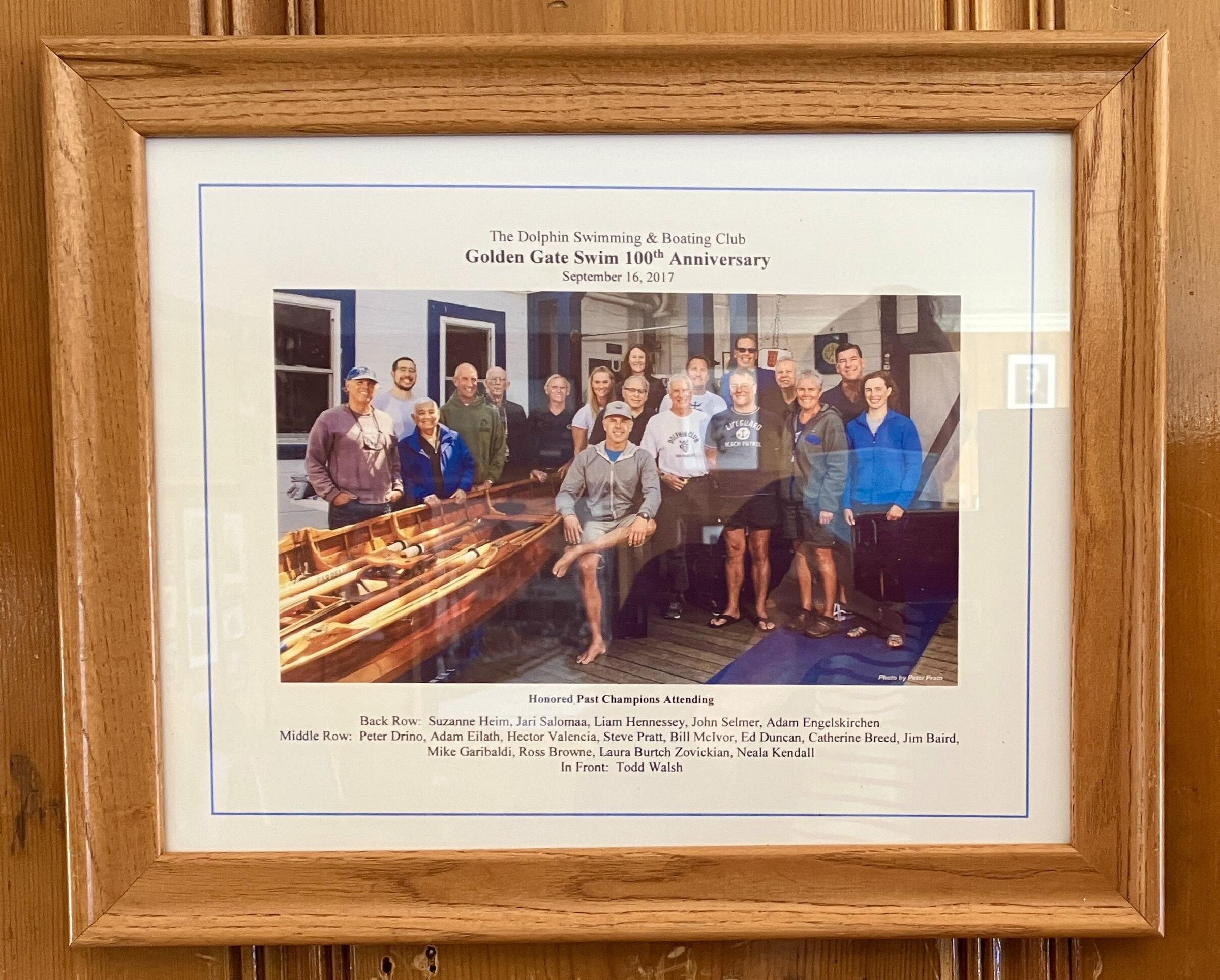 Framed color photo of 18 past winners of Dolphin Club Golden Gate Swim on the occasion of the 100th Anniversary of the swim. They are posing on deck outside of galley with the boat Chas. M. Farrell.