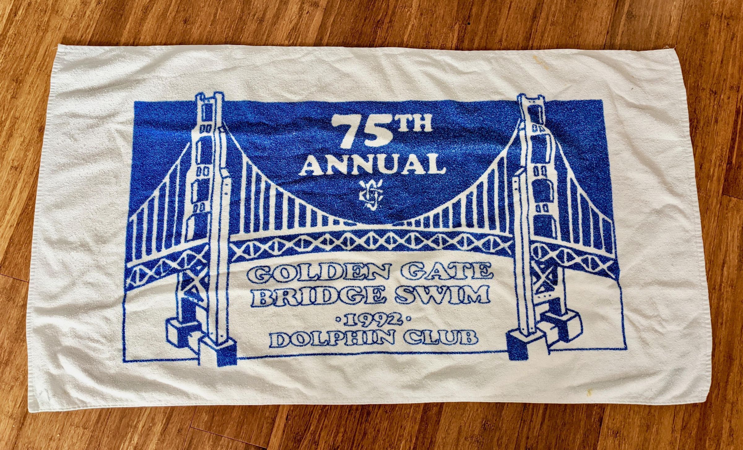 White towel for 75th Annual Golden Gate Bridge Swim in 1992. Image shows two tower span of the bridge, with blue sky, blue and white bridge, white under the bridge.