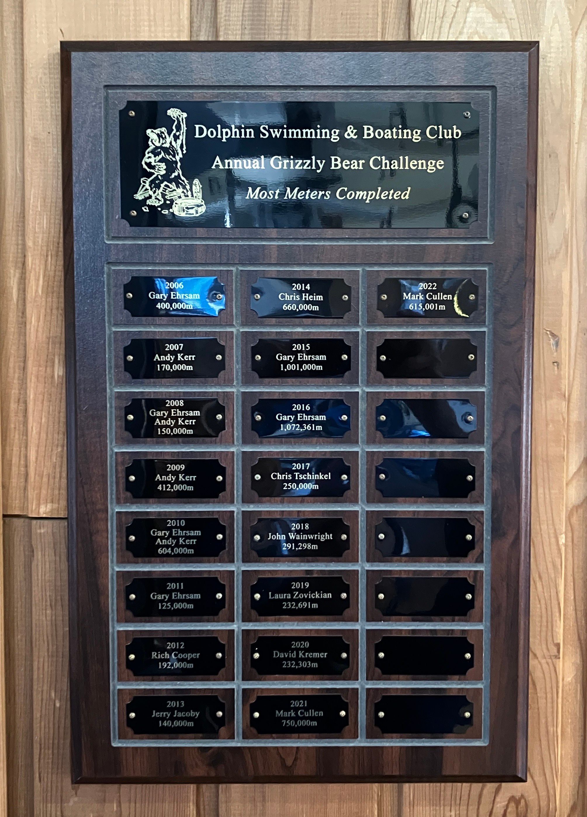 Text on large plate: "Dolphin Swimming and Boating Club - Annual Grizzly Bear Challenge - Most Meters Completed"