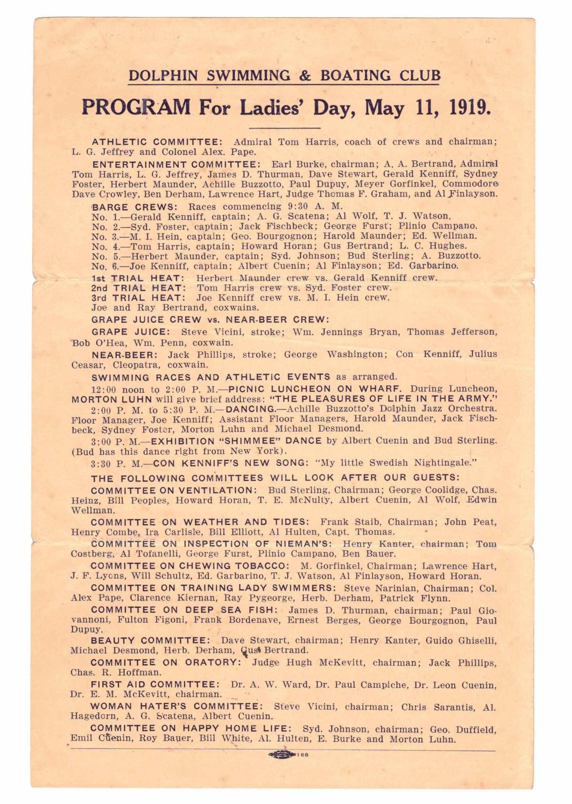 Includes listing of many spoof committees "to look after our guests" including committees on chewing tobacco, training lady swimmers, women haters, and happy home life. (!!) Lists members of each.
