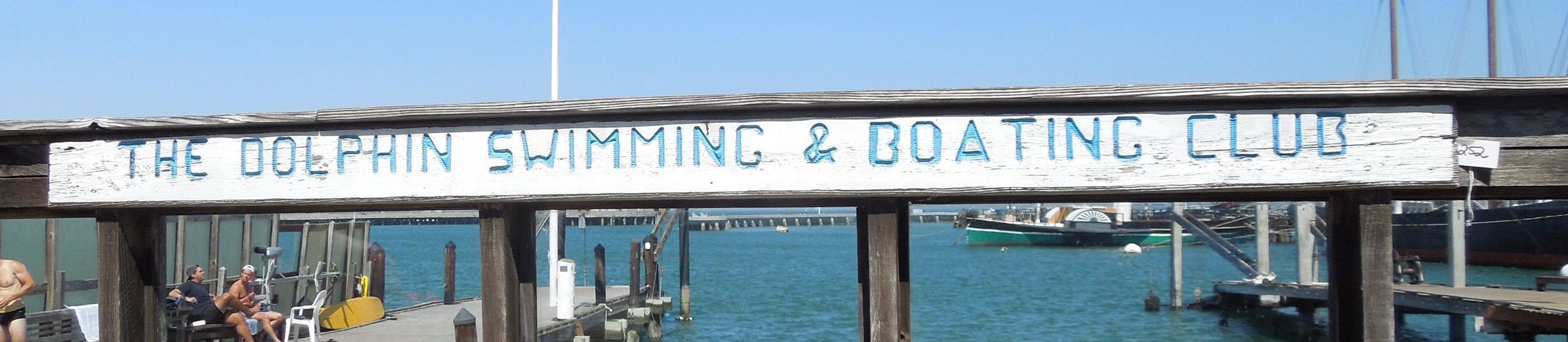 Wooden sign on north side of sun deck. Painted white, carved wooden letters painted light blue. Text: "The Dolphin Swimming & Boating Club"