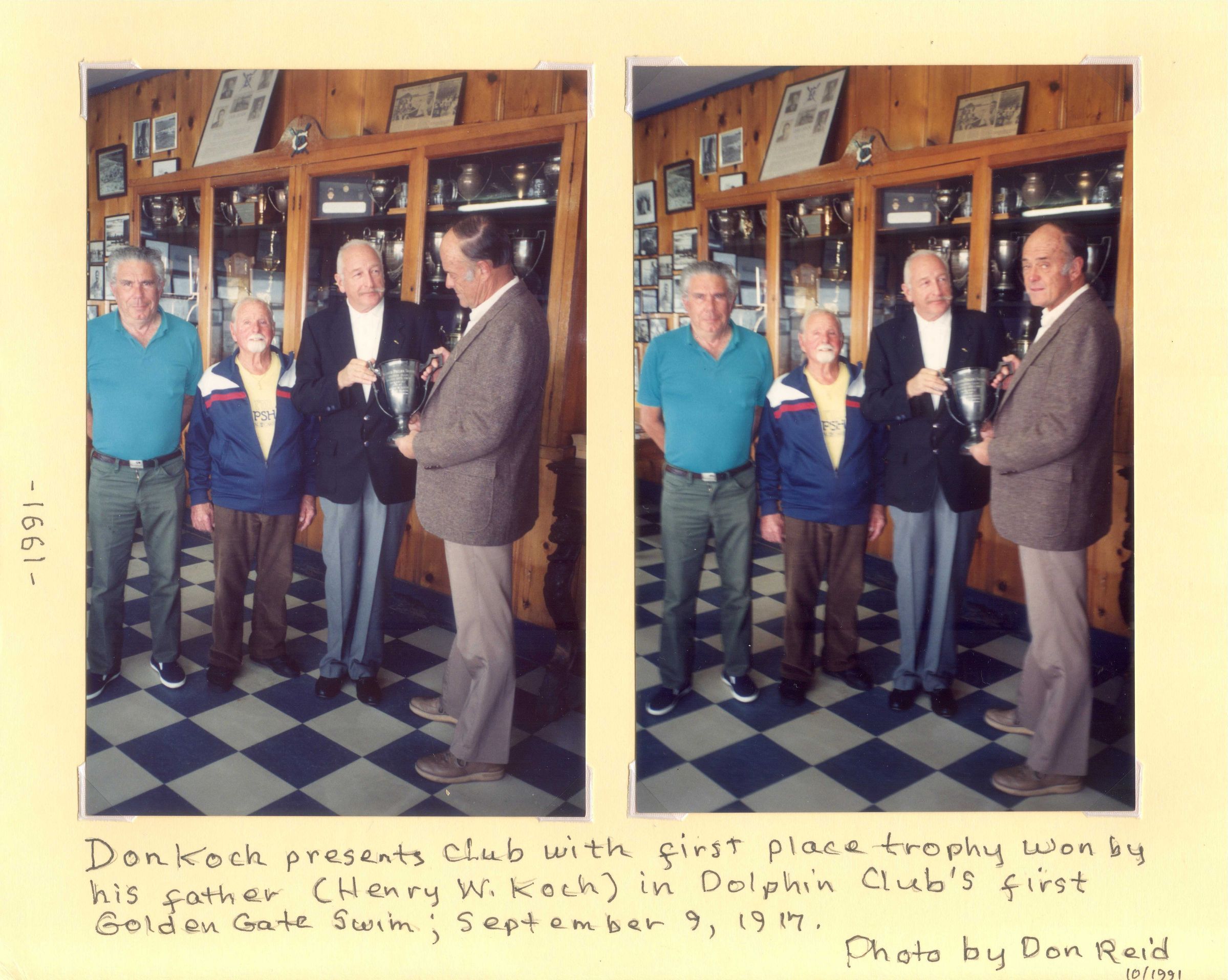 Presentation of trophy from the first Golden Gate Swim 1917 See the trophy Artifact 031. See attached article in Log Winter 1992.