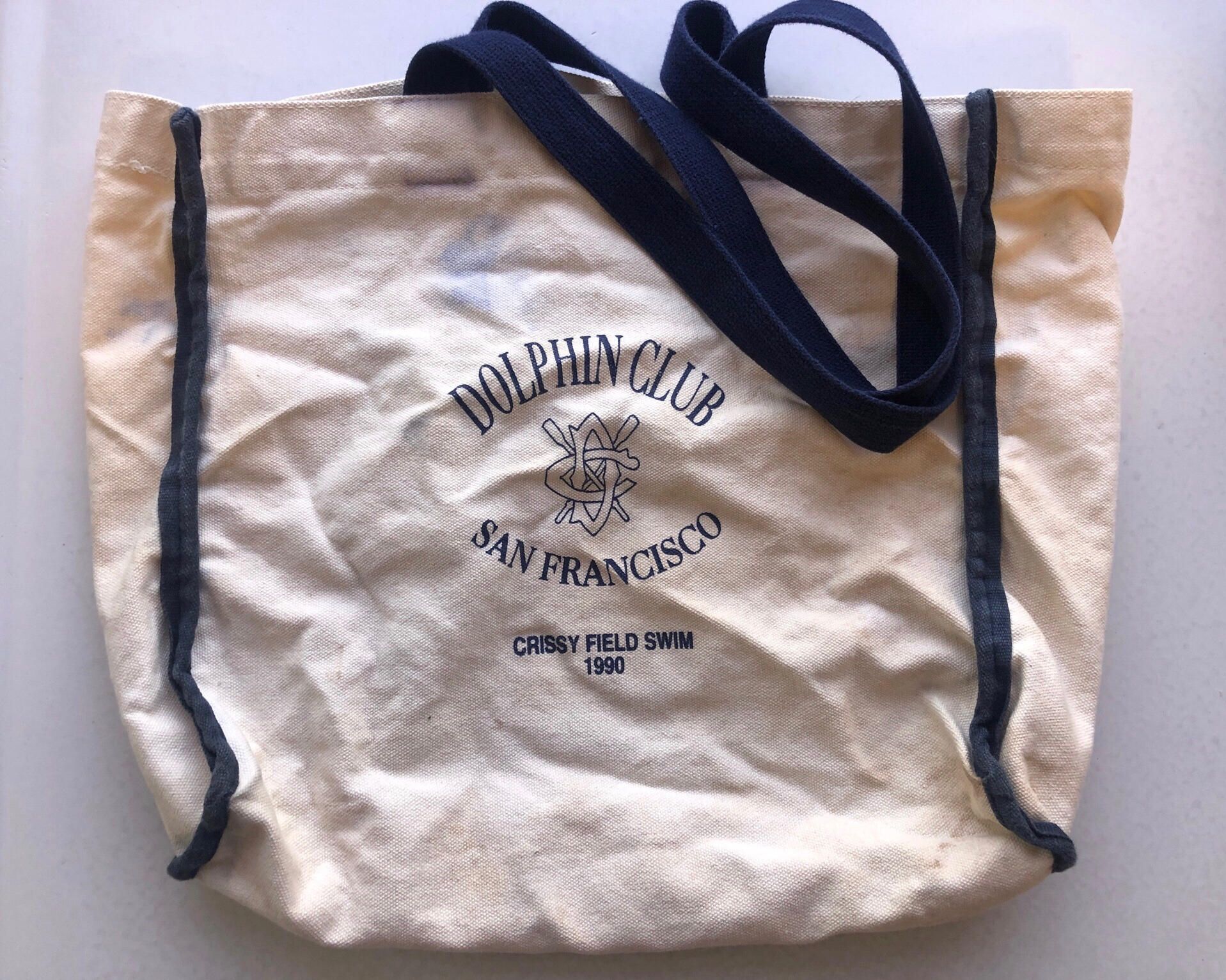 Light canvas bag in rectangular shape, with navy piping around both side panels, and any blue handles. On front in navy blue letters: Dolphin Club - outlined logo - San Francisco - Crissy Field Swim - 1990."Use