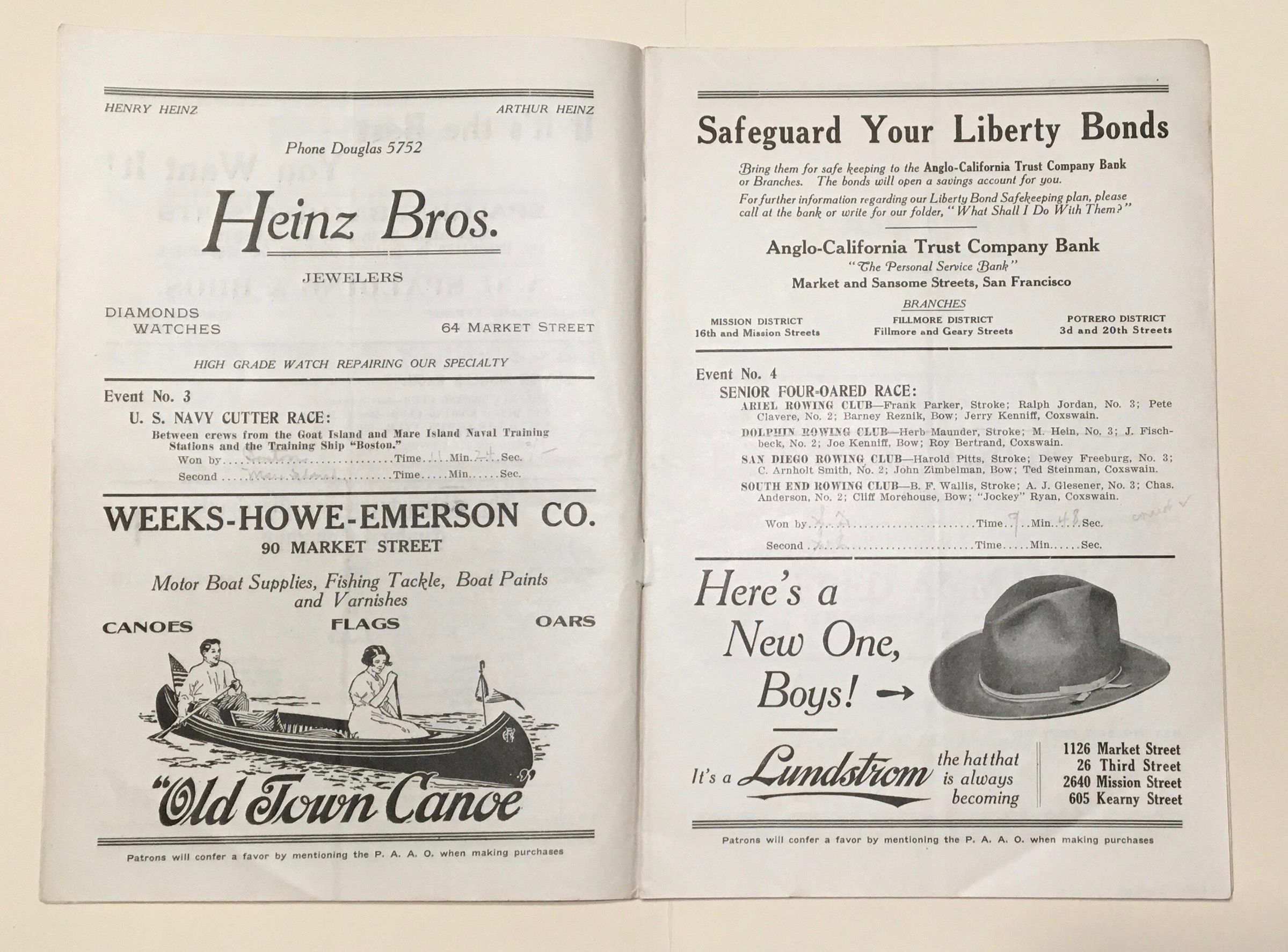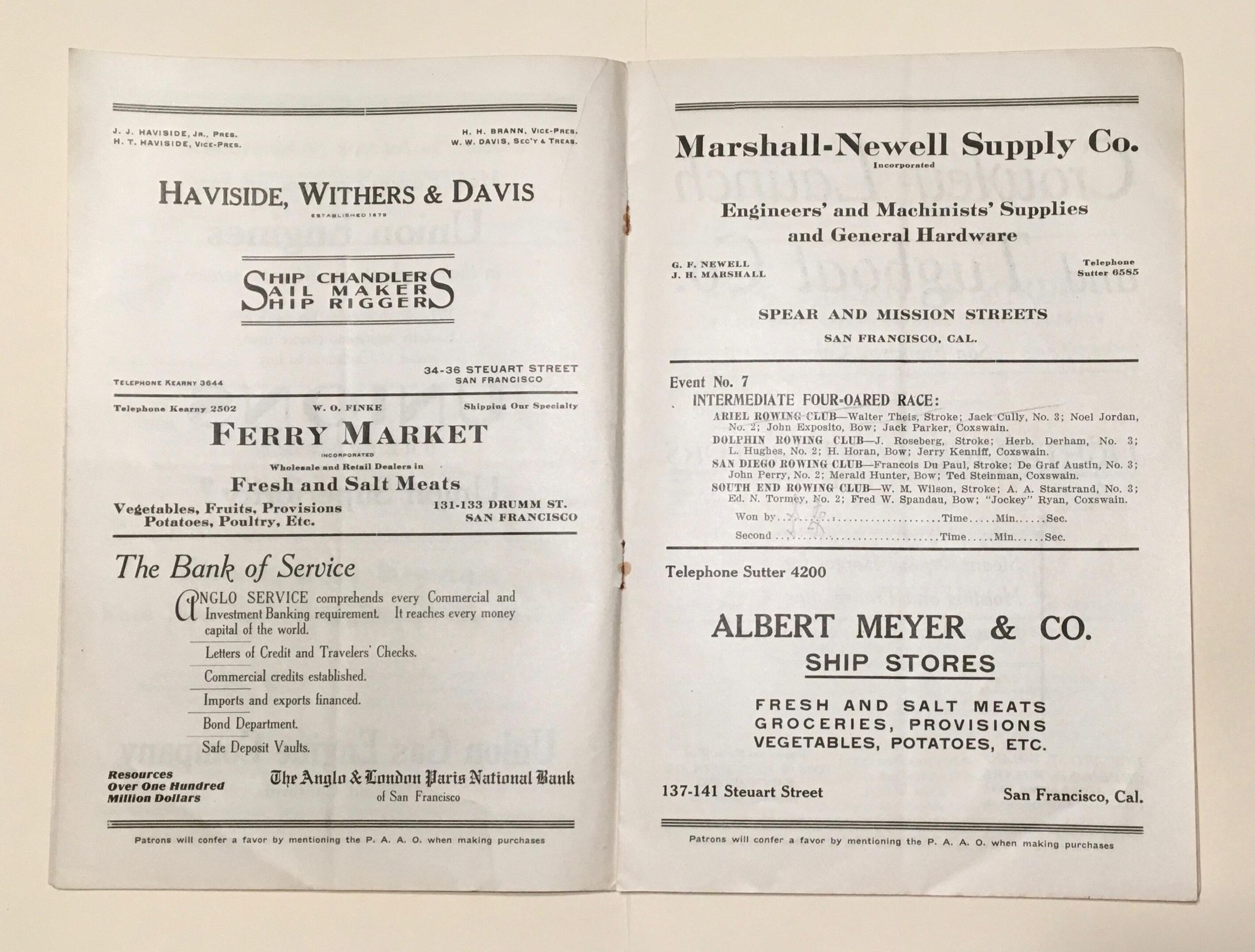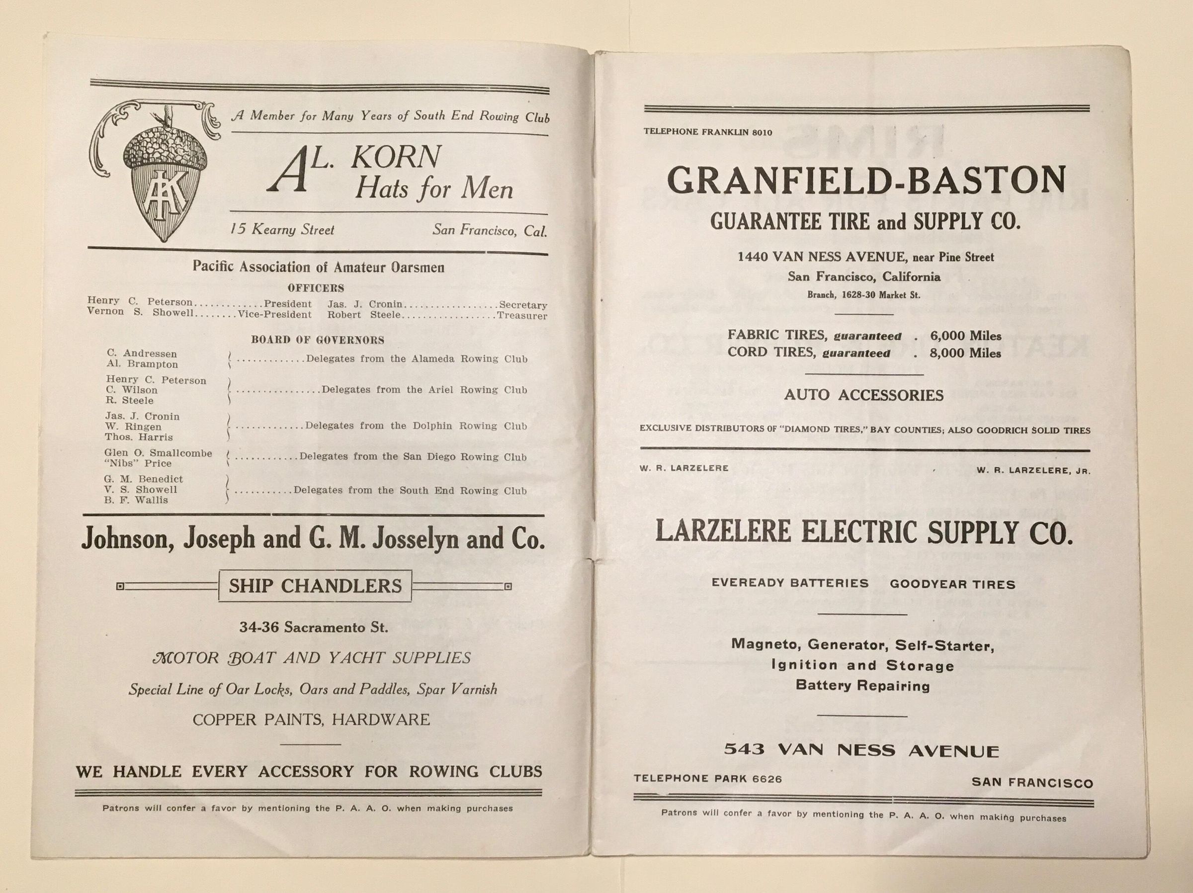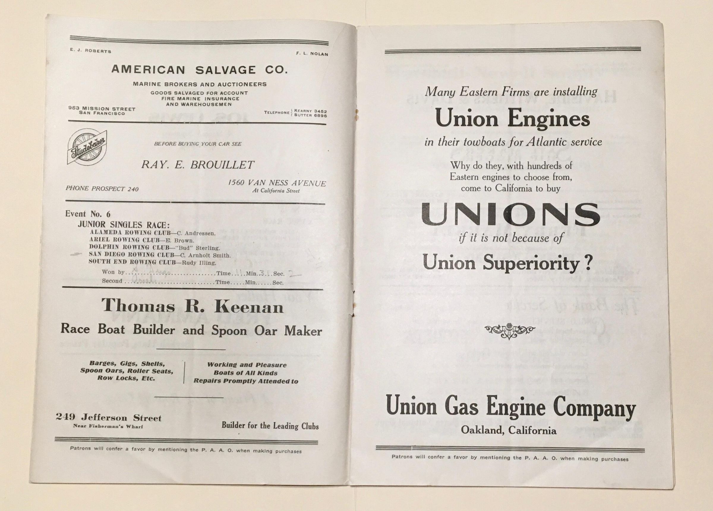 Program for PAAO 16th Annual Championship Regatta, July 4, 1919, at China Basin, San Francisco. 28 pages plus front cover and back cover, 2 staples for binding. Photo of Henry Peterson on front cover.