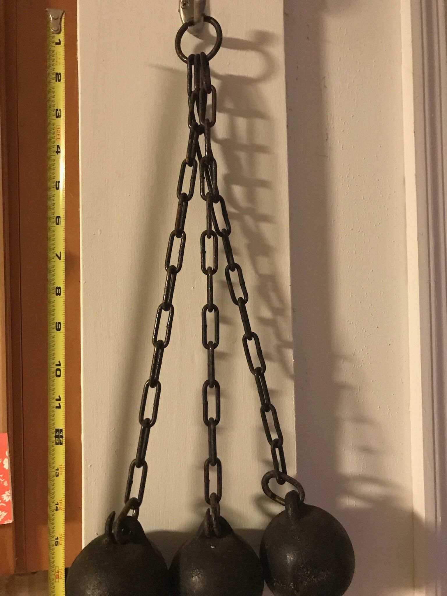 "Trinket" given to all finishers of first Escape From Alcatraz Triathlon" in July 1981. Consists black metal ring, three lengths of black metal link chain, and three black metal fishing weights each weighing 3 pounds.Use